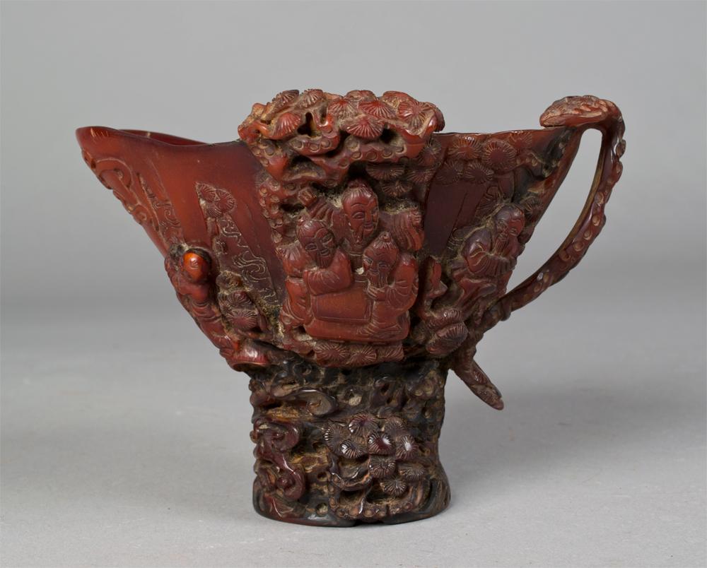 The whole finely carved to depict scholars and a boy surrounded by pine trees and a bat at the mouth of the spout. Showing wonderful old mellow patina. 4.75" H. Circa Republic Period.