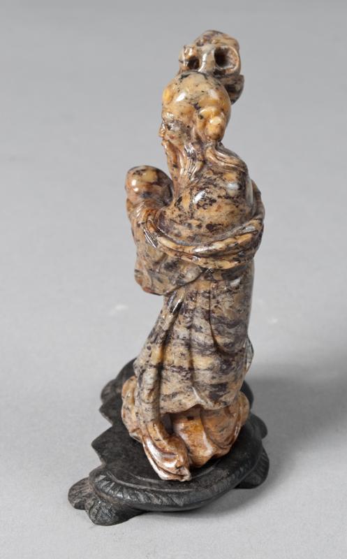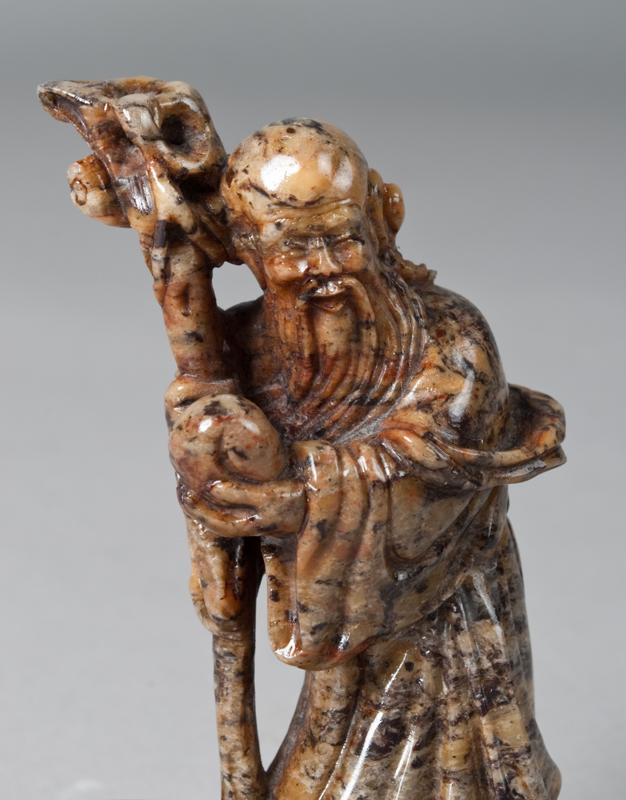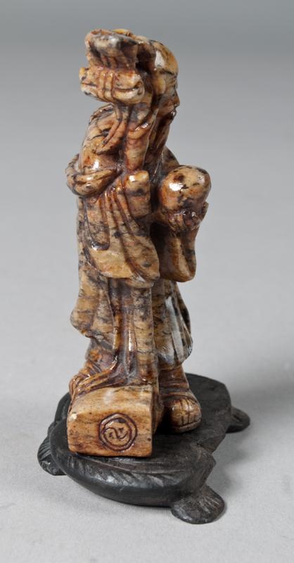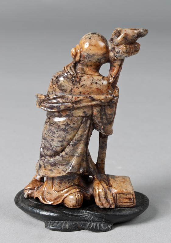 Finely carved to depict an elder holding a staff and a peach alongside a chest. The stone a molted celadon color, mounted on a carved hardwood stand. 4" H, probably 19th Century. Private collection Troy, MI.