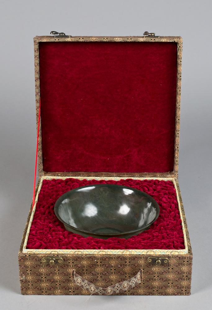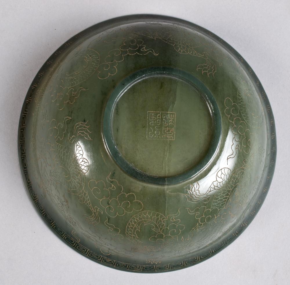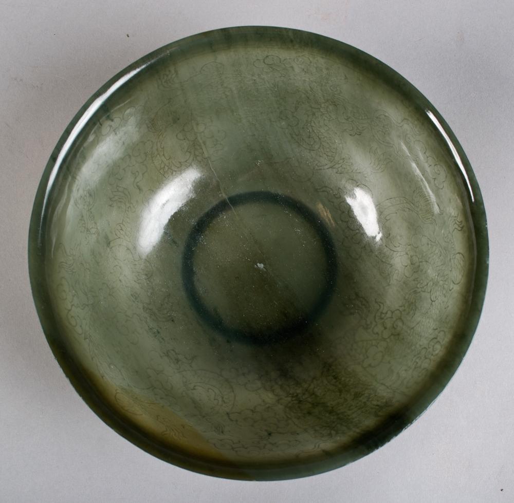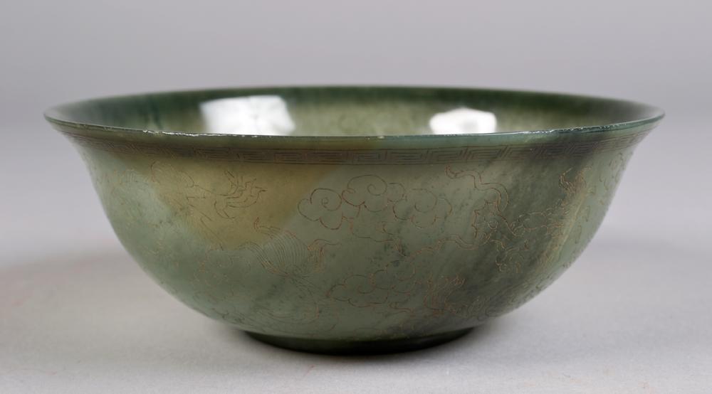 The exterior finely carved to depict dragons chasing flaming pearls, the underside of rim with Greek and key border the footed base with four character seal mark carved within a square the stone a semi translucent jade, 6"D X 2.25"H in fitted silk box, circa 20th century.