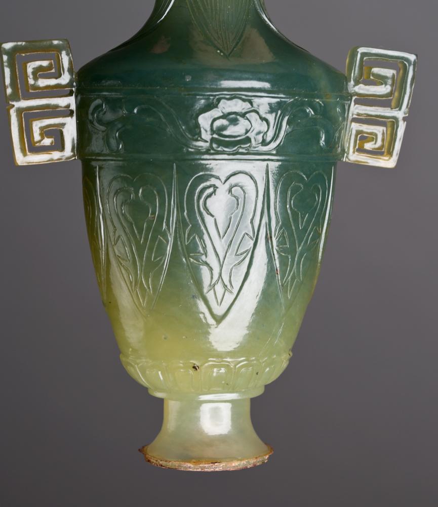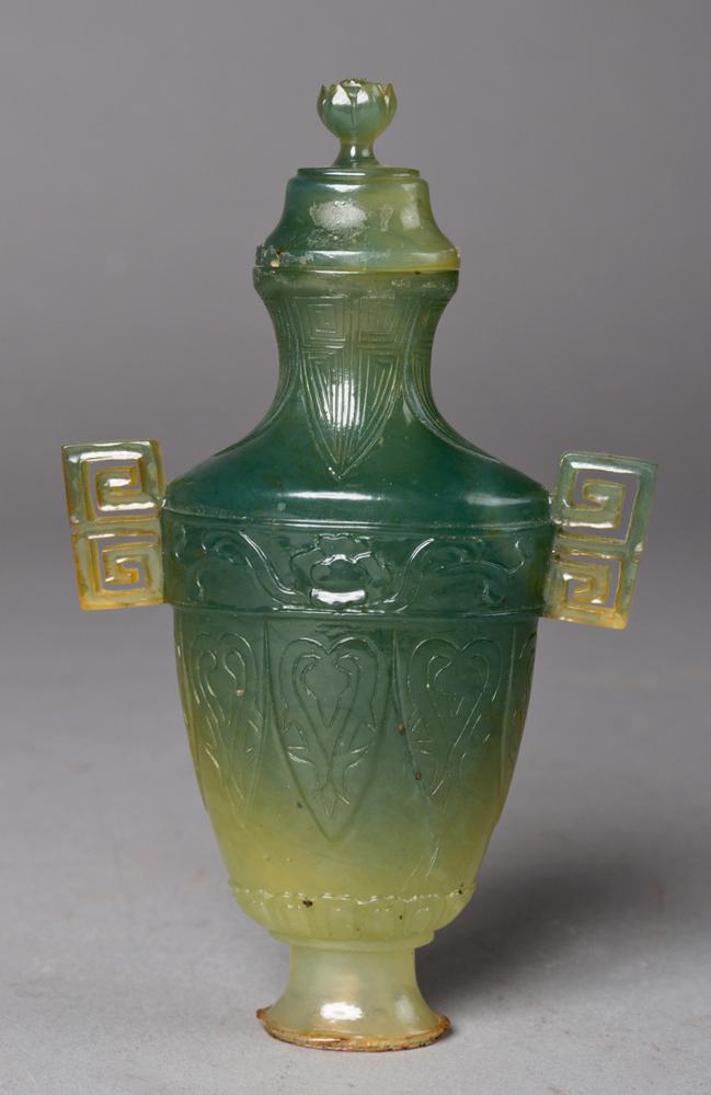 Finely carved to depict a central band containing a lotus blossom and tendrils with stiff lappets on the neck and lower body with two Greek and key carved handles and open lotus blossom for the finial, the stone a deep green to light celadon with fine polish, 5.75"H, circa 19th century.