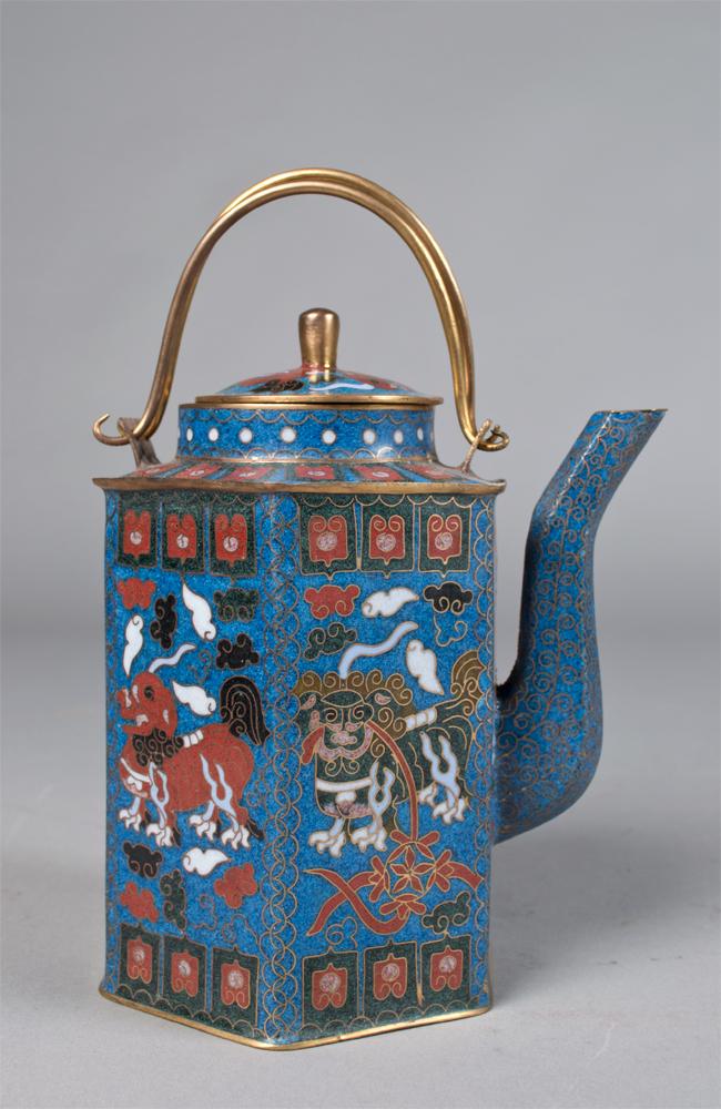 In hexagonal shape, finely enameled to depict dragons in a blue ground, and additional colors of light blue, red, white, green and black. 8" H (with handles) x 4.5" W. Circa 20th century.