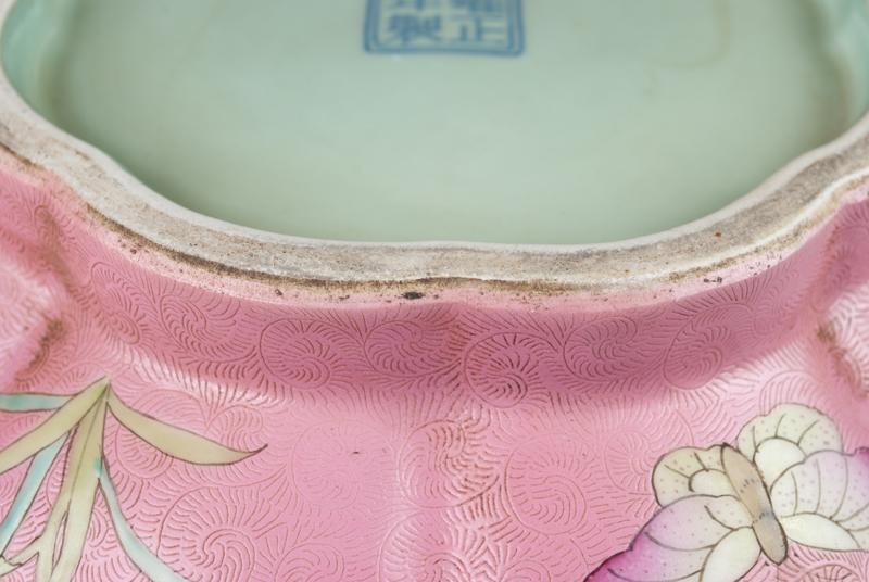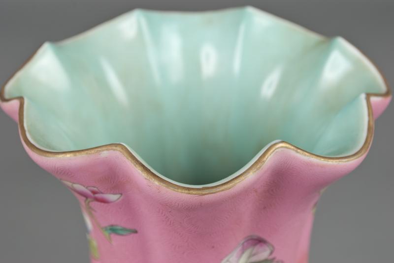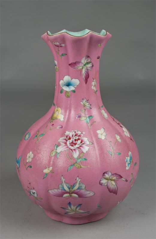 Finely enameled with flowers and butterflies against a pink graviata ground, the base with four character seal mark in blue enamels within a double square. 15.25" H, circa 20th century.
