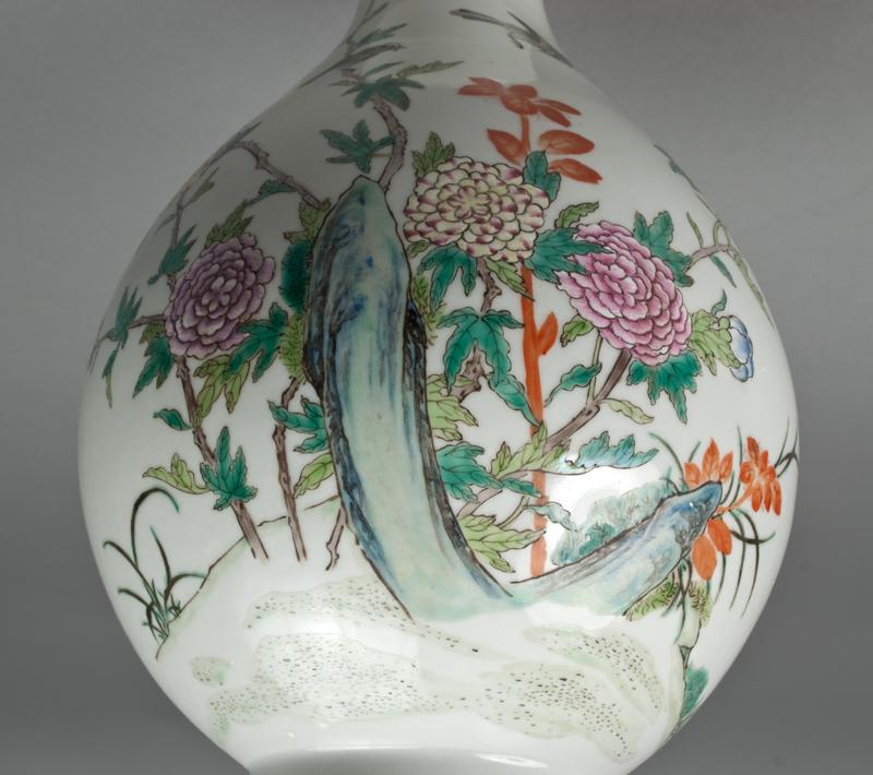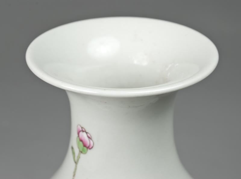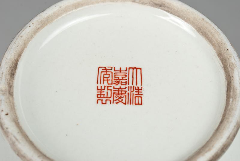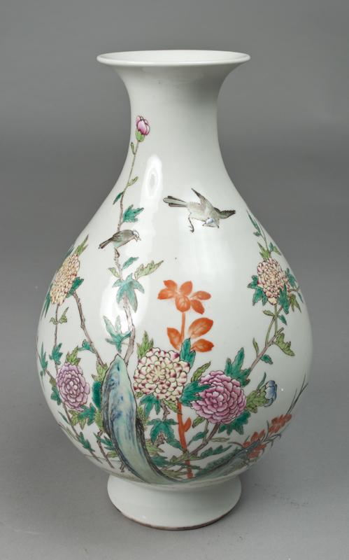 Finely enameled decorated with a peony bush with yellow and pink flowers with two birds atop bush. Six character mark in iron red for Great Qing Qianlong Production on underside. 12" H, 20th century.