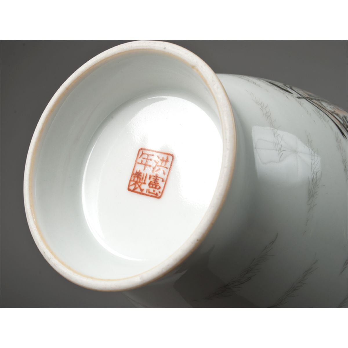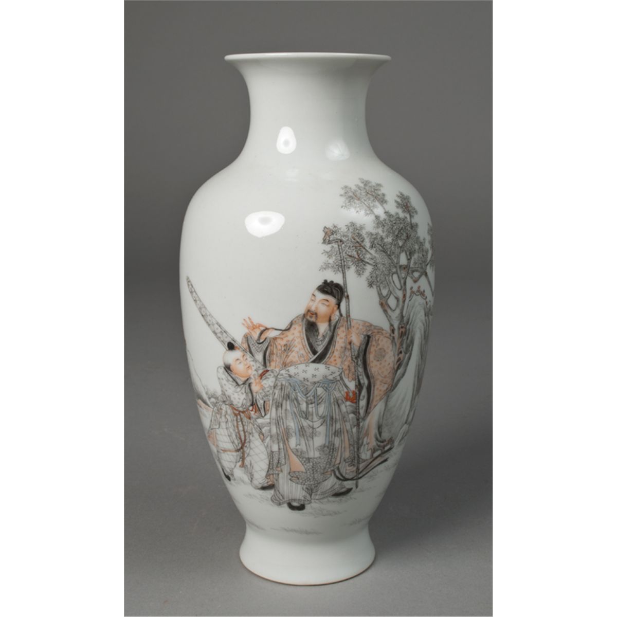 Finley enameled to depict a warrior with flowing robe and smaller figure by his side in a landscape setting. Four character mark within a square in iron red on underside. 9.5" H, 20th century. Private collection Las Vegas, NV.