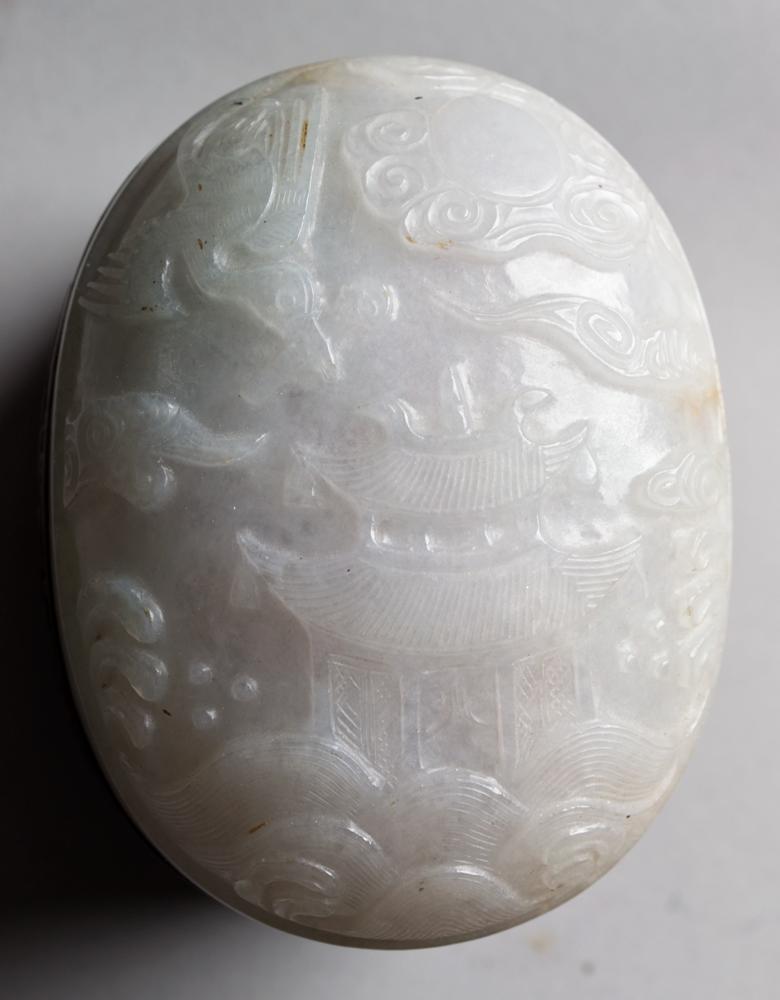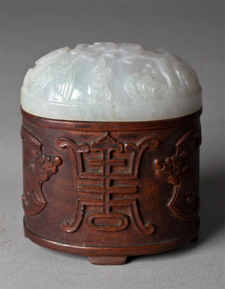 The box finely carved to depict bats and shou symbols on four ruyi shaped feet, with a fine burlwood grain, with a finely carved celadon jade top finely carved to depict a crane flying holding a precious object, a house above crashing waves and ruyi clouds the stone a light celadon very well carved and finely polished, the plaque measures 3.5"L X 2.5"W X 1.25"Deep, total is 3.75"H X 3.5"L, the box 18th century the jade cover 18th-19th century condition box with two old faint hairline cracks the jade cover with slight chip to edge, a very nice piece.