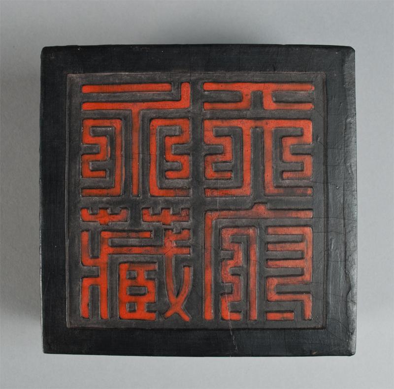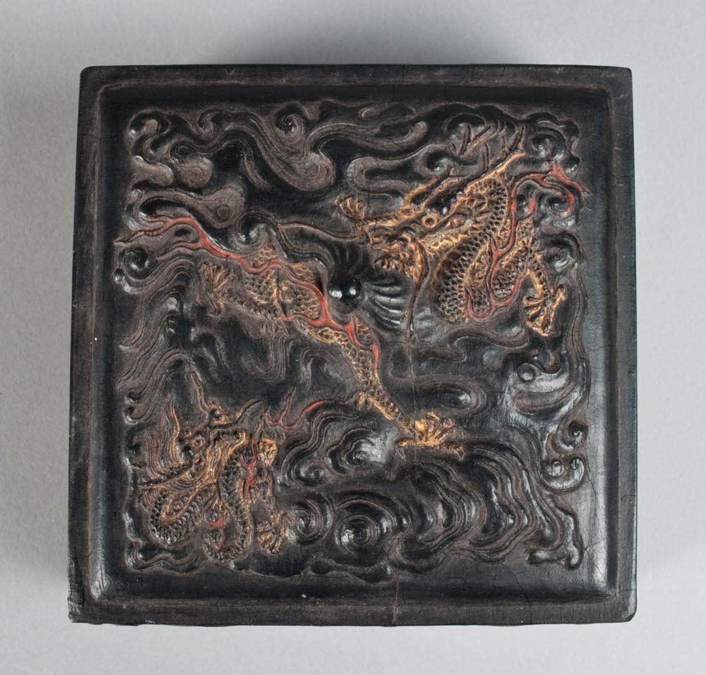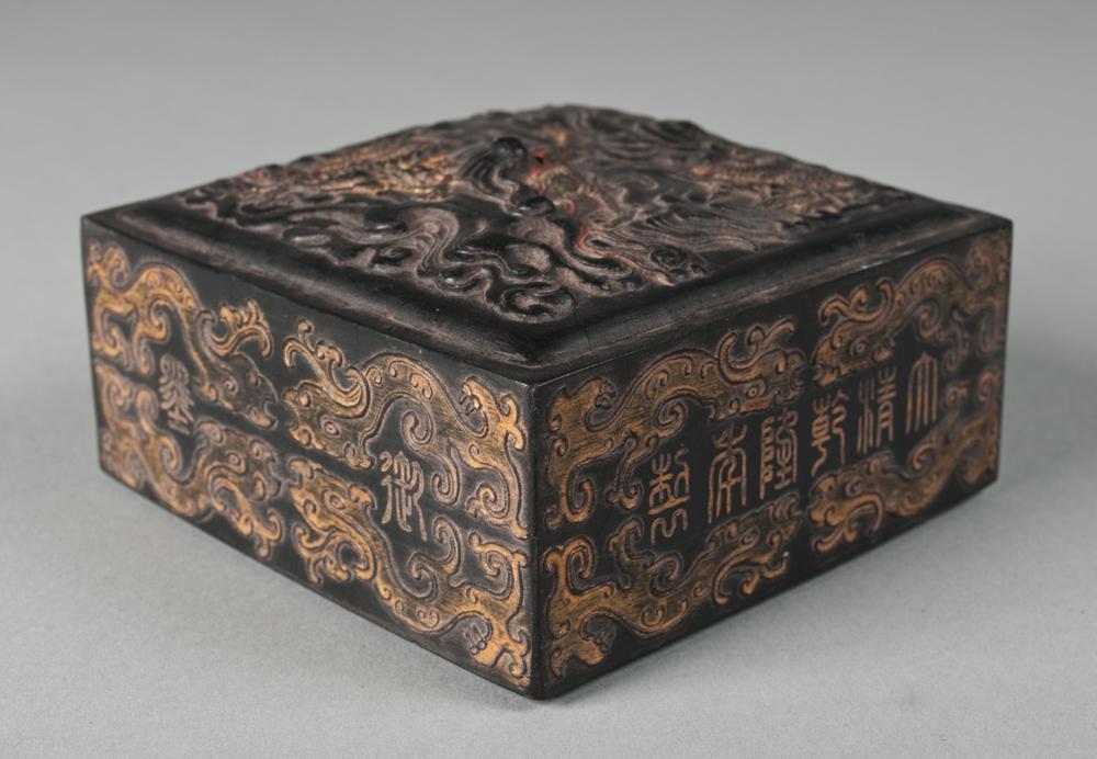 Finley carved to depict two dragons amongst ruyi clouds chasing a flaming pearl, the sides each with four dragons two sides with six character mark highlighted in gilt, the bottom with carved four character mark, 4.375"Sq. x 2.75"H.
