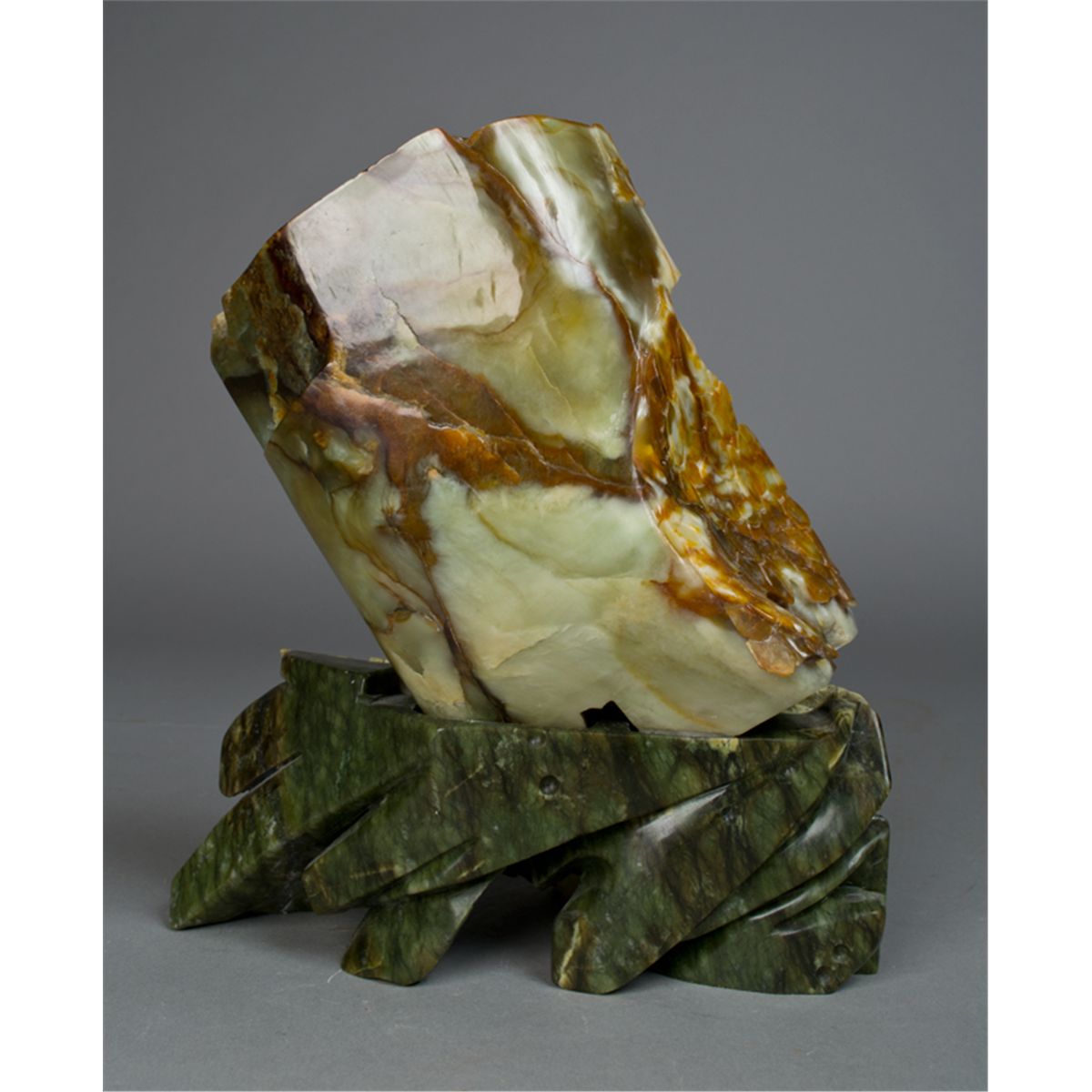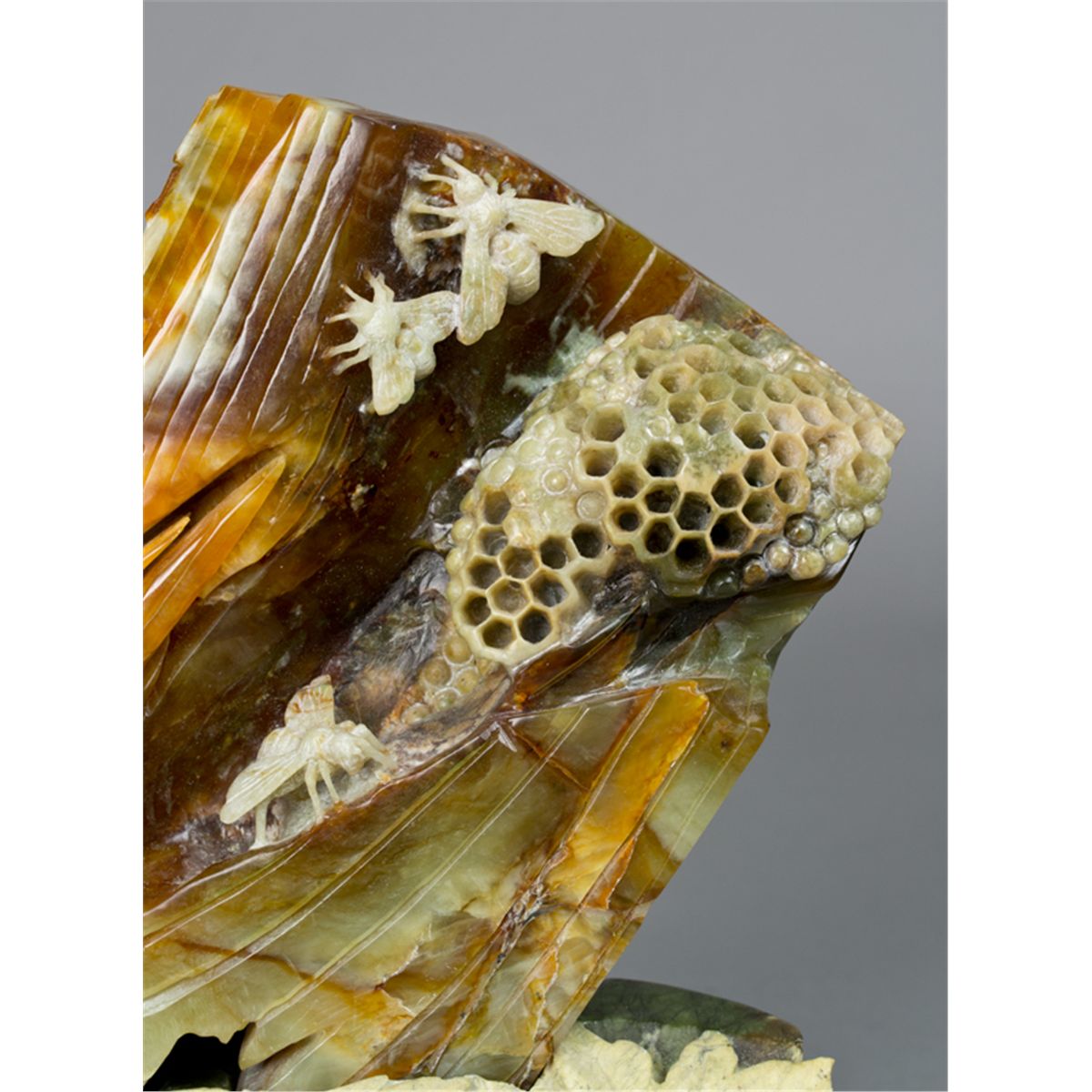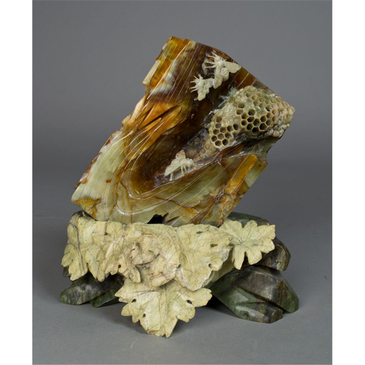 Finely carved to depict three bees and honeycomb on an open wood stump, with custom carved jade base with leaves. 9.5" H x 9" W, overall, circa 20th century. Private collection Glennie, MI.
