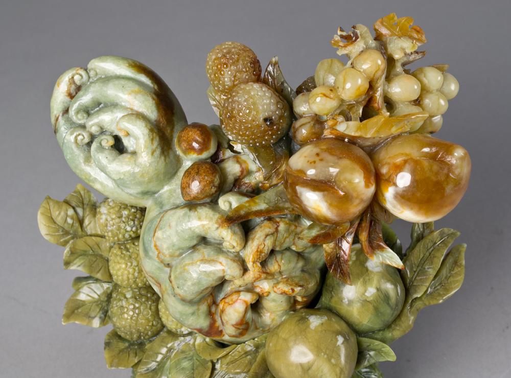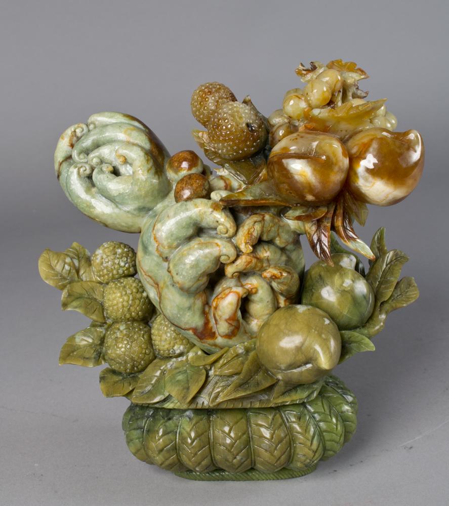 Finely carved to depict two Buddha hand with peaches and berries on a jade carved base with peaches and berries, 9.25"H X 8.5"W including the stand, circa 20th century.
