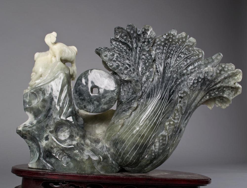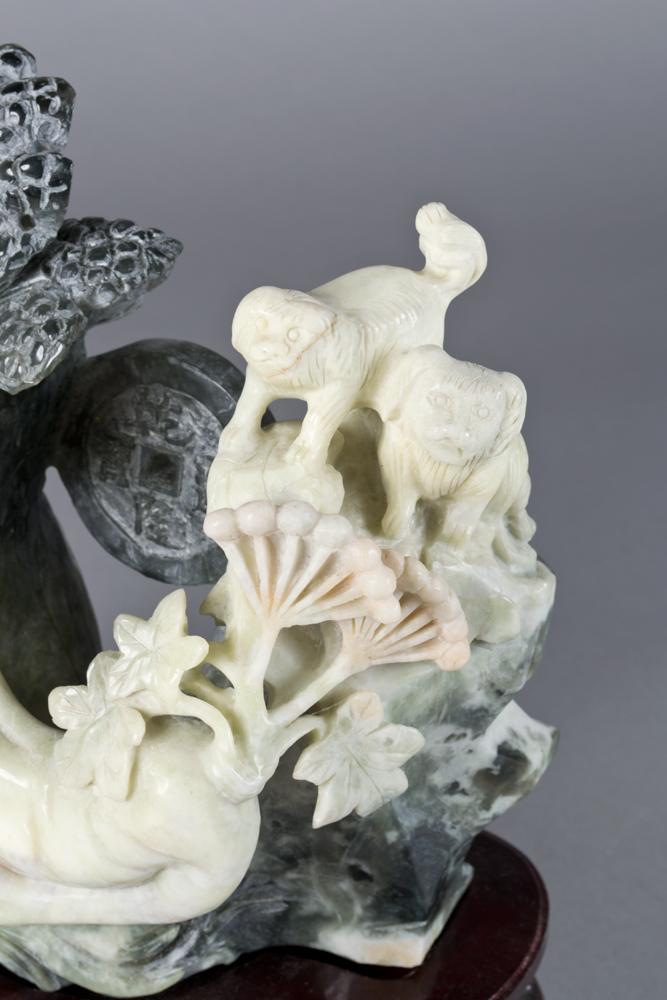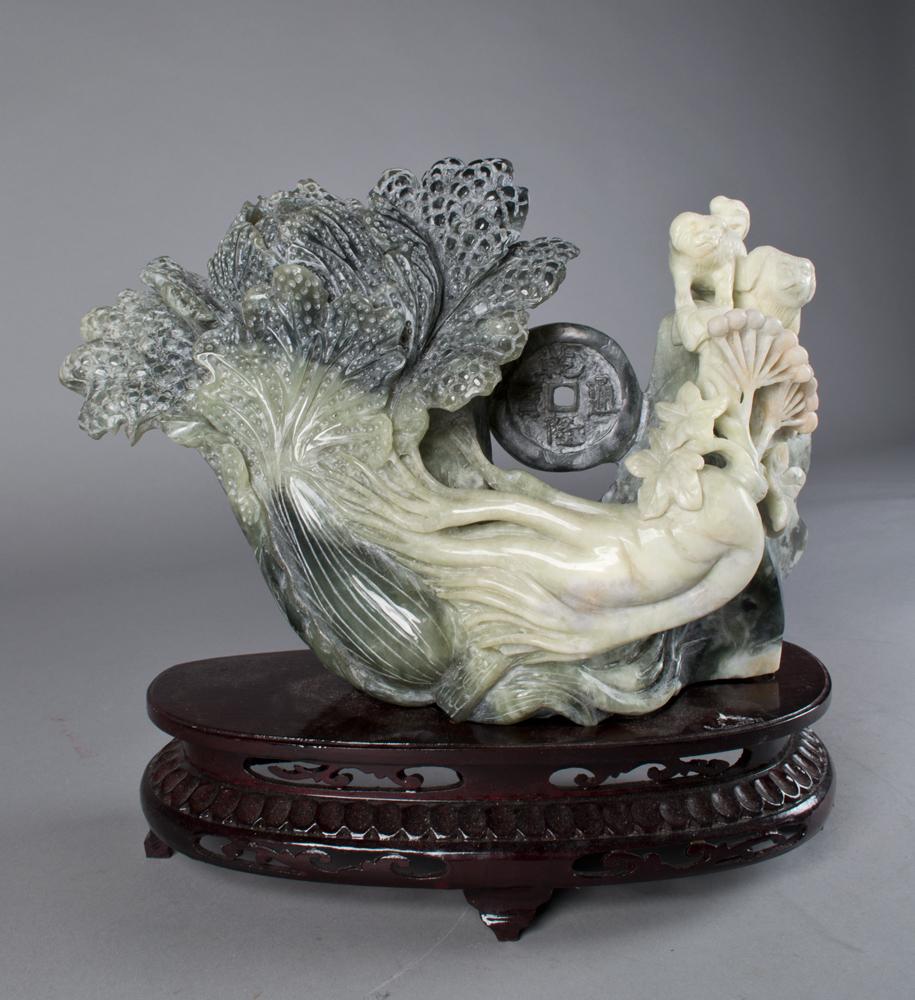 Finely carved to depict a large cabbage Chinese coin and dogs on a custom wood base, 9.25"H X 13.5"W not including the stand, circa 20th century.