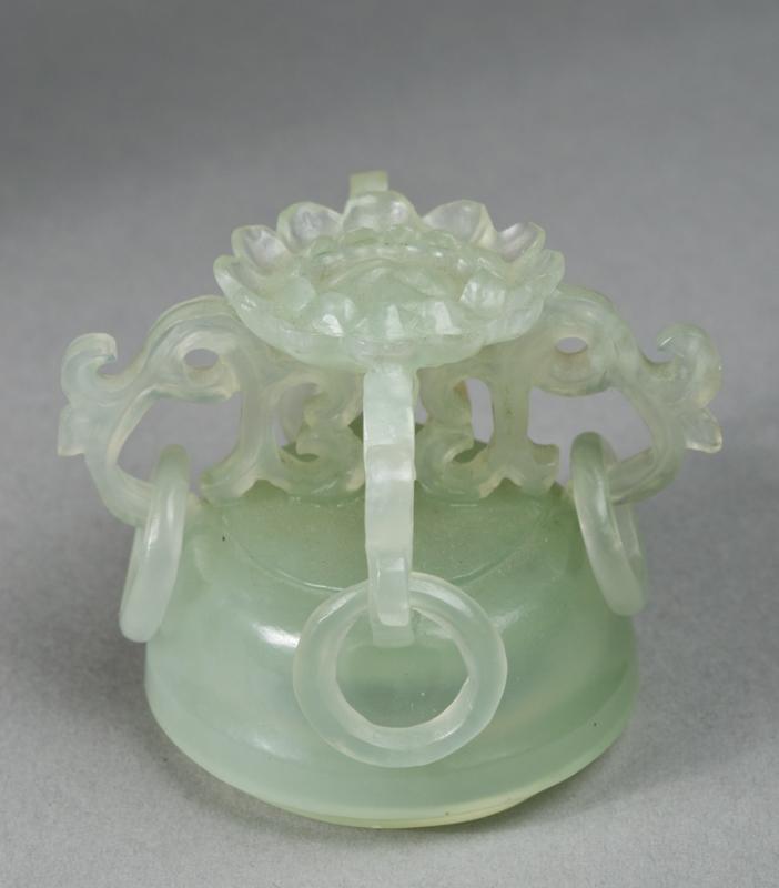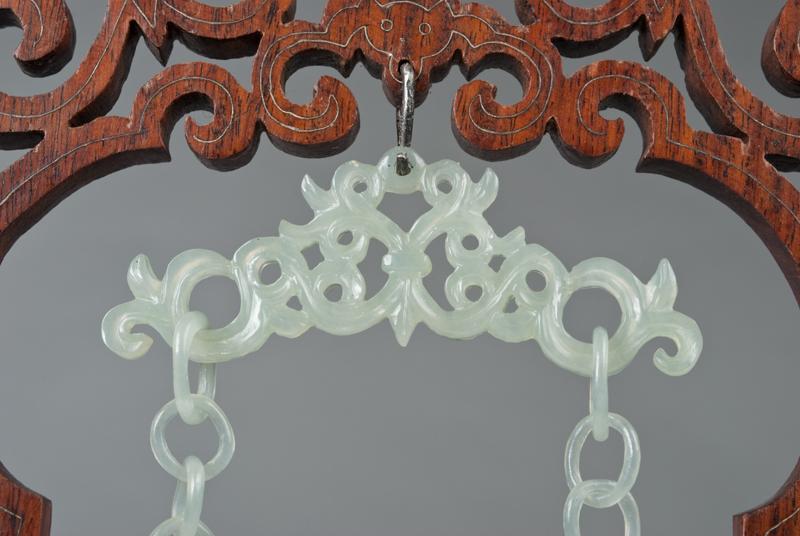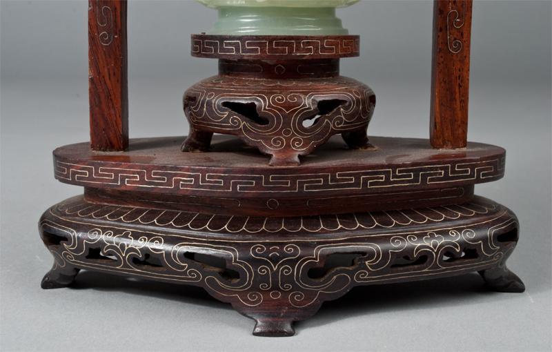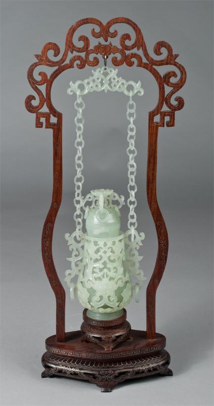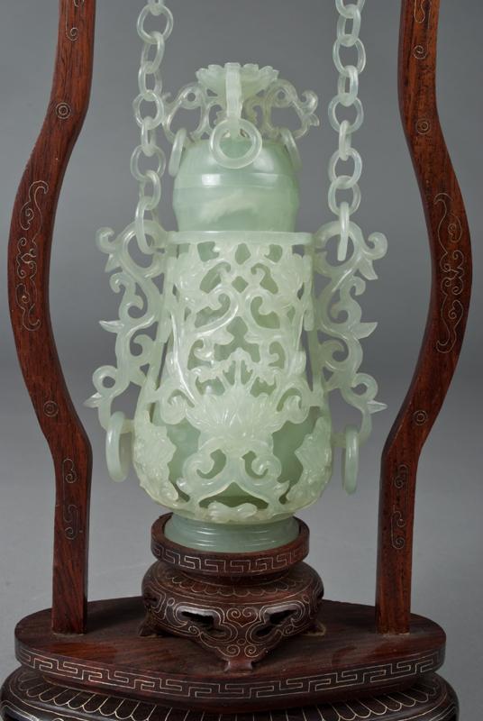 Finley carved vase with outer loose cover finely carved to depict flowers, the handles with loose rings, the lid with lotus blossom and four loose rings, hung by jade chains, on a inlaid wood, the vase 6.5"H, 17.5"H total.