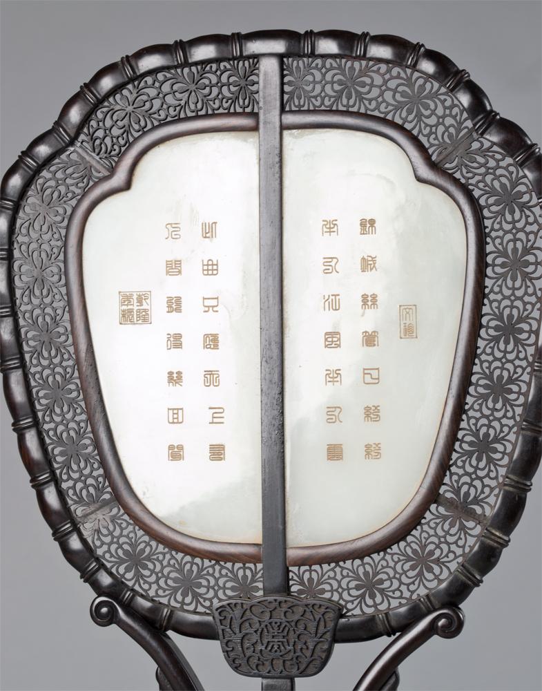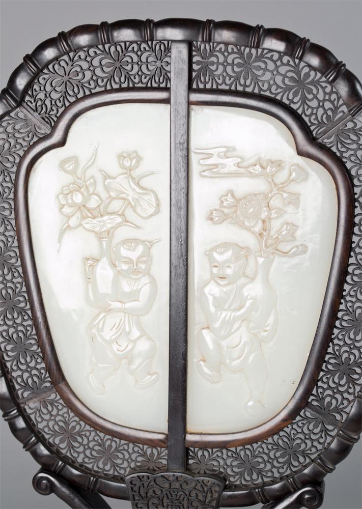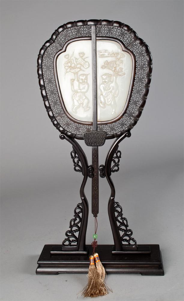 Finely carved on one side to depict boys holding vases of flowers the reverse with four lines of calligraphy highlighted in gilt, jade measures 6.5"H X 5.5"W, total heights 19.5"H in fitted silk box circa 20th century.