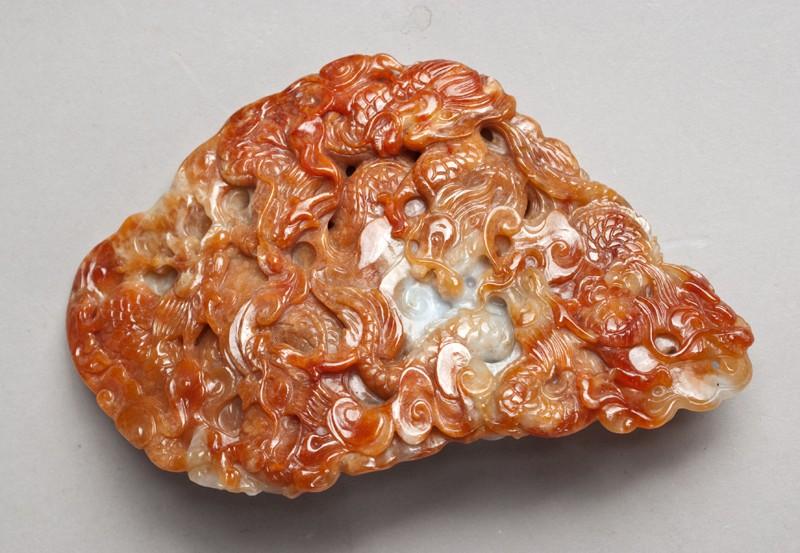 Finely carved to depict two dragons chasing the flaming pearl, 5.75"H X 3.5"W.