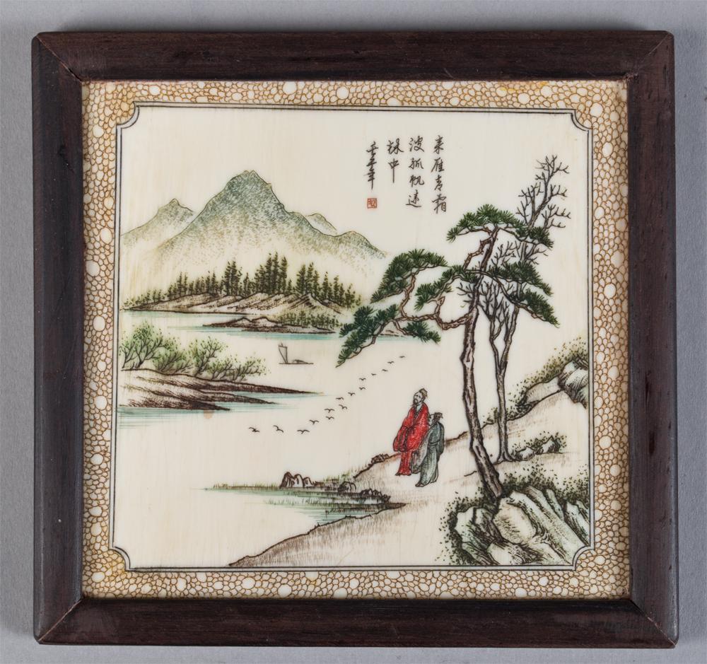 Finely etched and painted to depict figures by a lake signed and sealed upper right the reverse finely carved with four lines of calligraphy and signed and sealed mounted in hardwood frame 4.25"W X 4"H circa early 20th century.