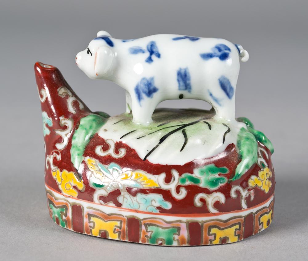 Depicting a blue and white pig atop and enameled and painted base with ruyi and butterflies impressed four character mark on underside, 2.5"H X 3.25"W, in custom fitted box circa 20th century.