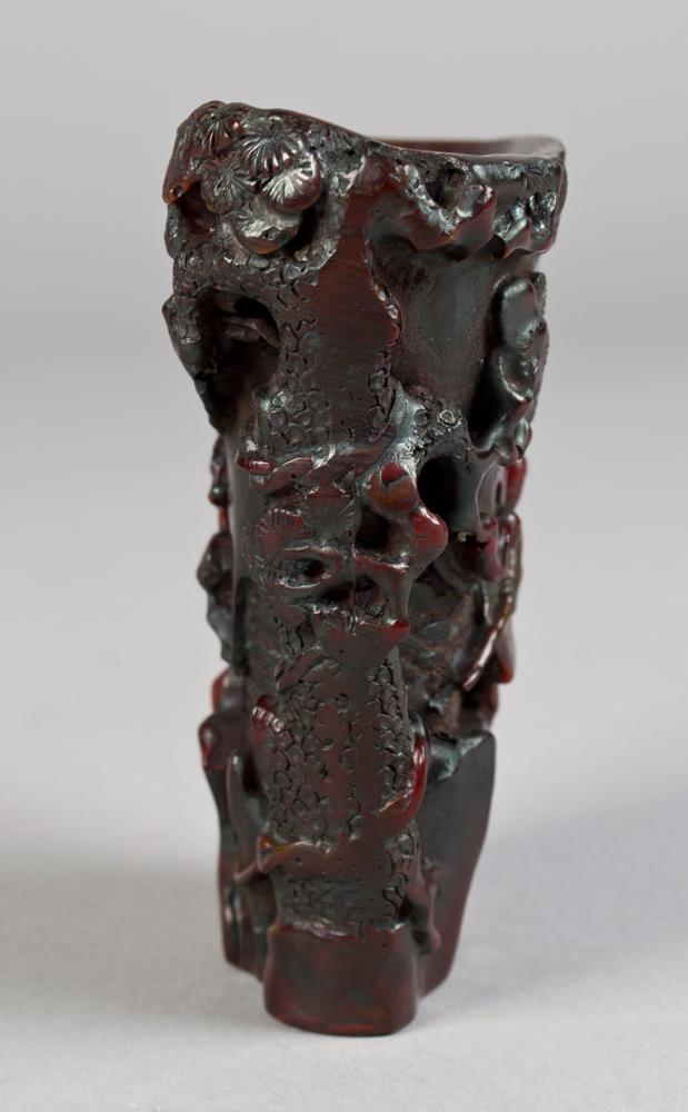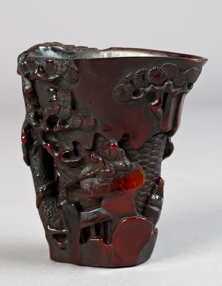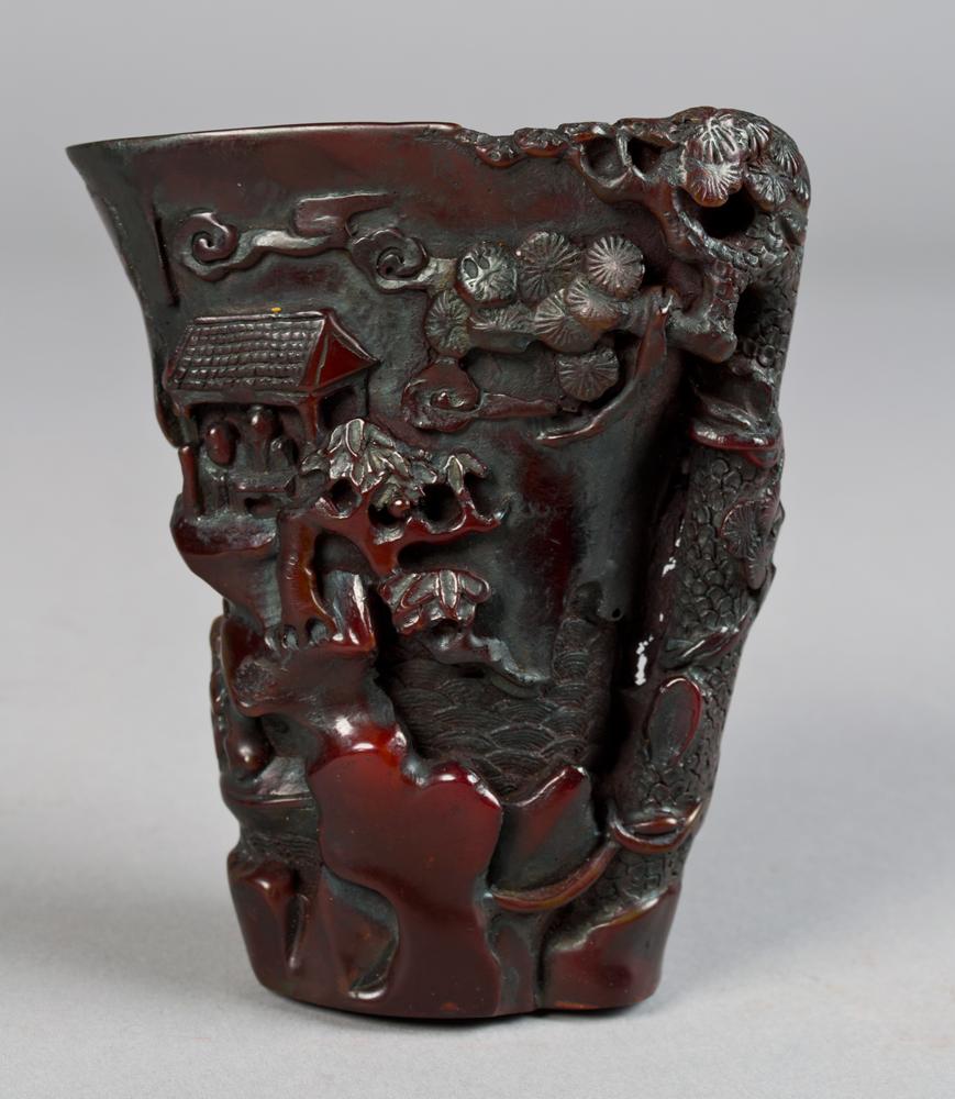 Possibly rhino horn finely carved to depict figures within a village setting beneath an ancient pine tree, the handle formed as the trunk of the pine tree with a rich nutty brown patina very well done 4.125"H circa late 10th-early 20th century.