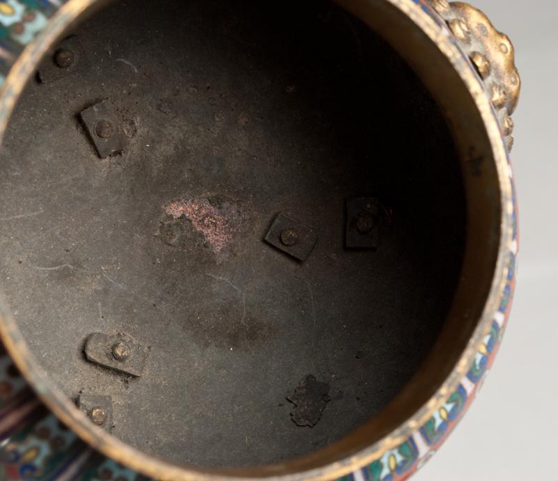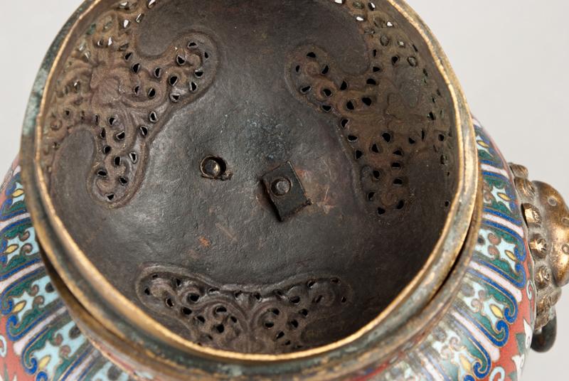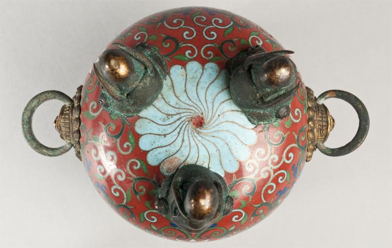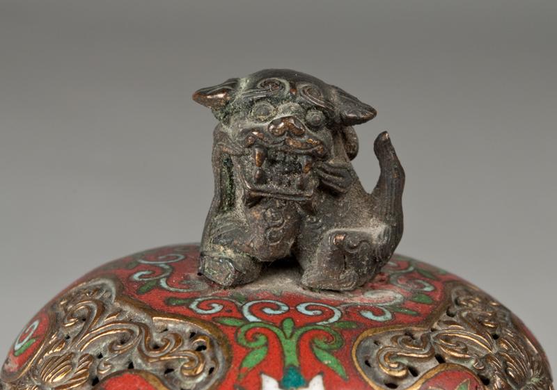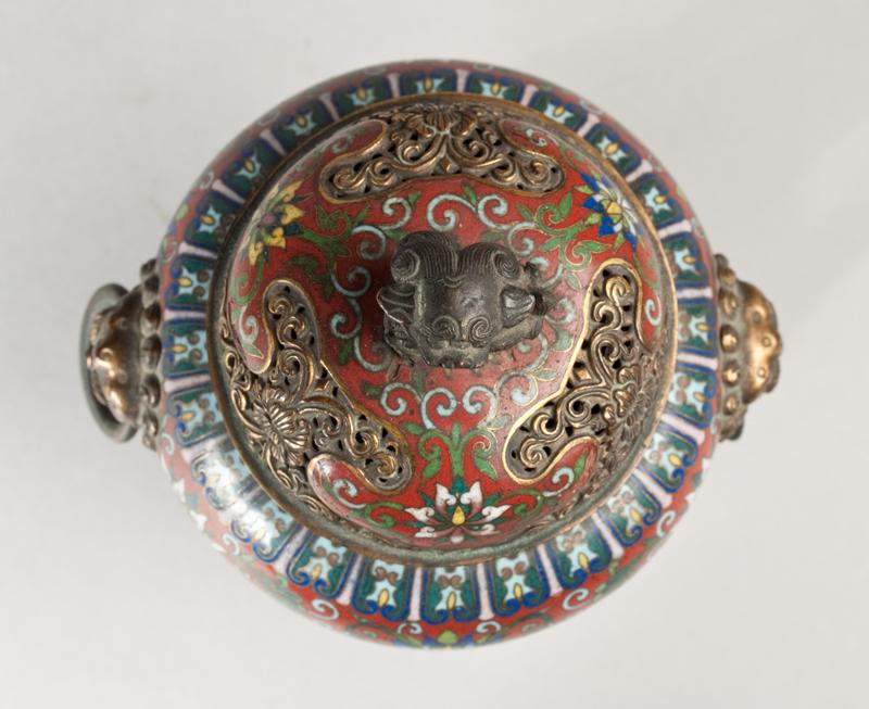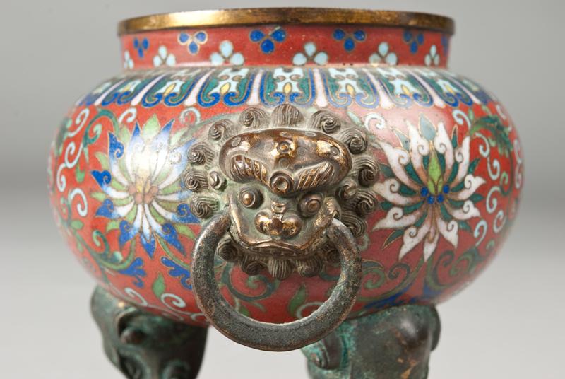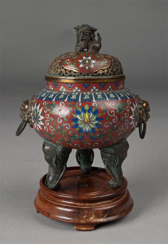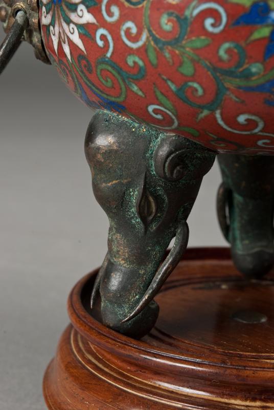 With finely cast legs in the form of elephant heads with tusks, the handles in the form of mythical beasts with loose rings, the finial in the form of a foo lion, the body with red ground, the lid a combination of finely cast bronze and enamel, 5.5"H, not including the wood stand, circa 18th, or 19th century, small loss to the enamel in a couple spots hardly noticeable. Private collection Highland Park Ill.