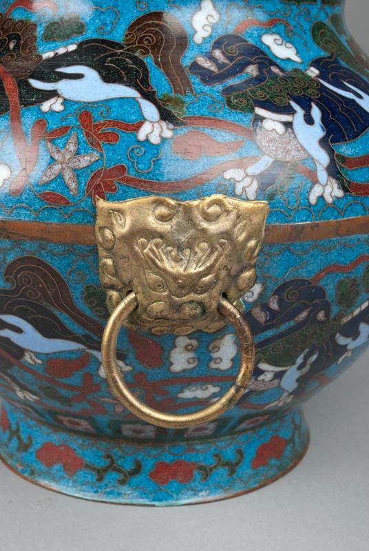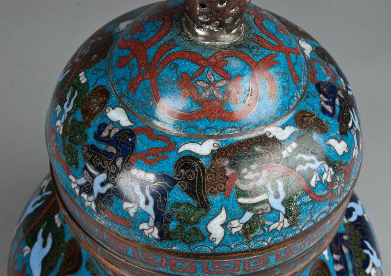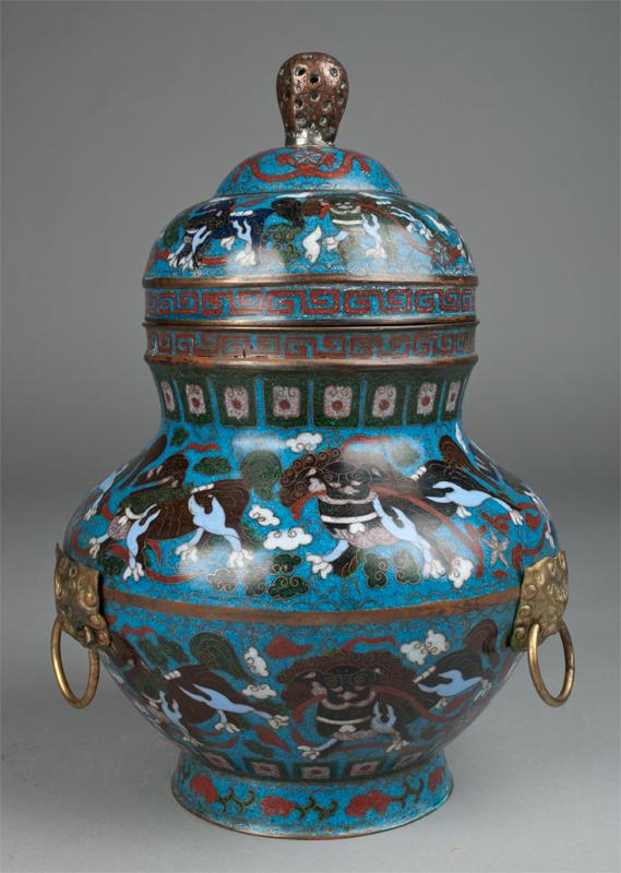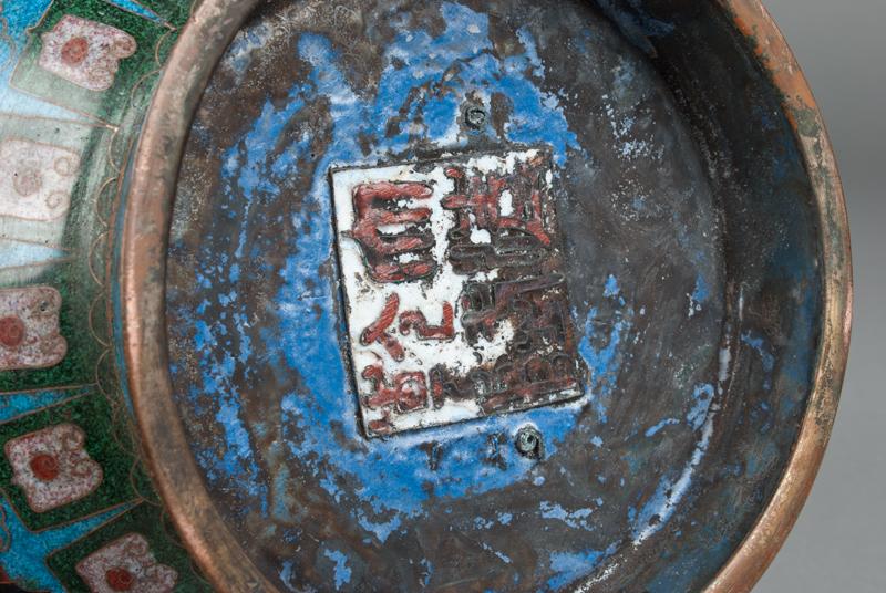 Finely enameled with horizontal bands of foo dog, brass mock beast ring handles, the base with raised mark for Great Qing Qianlong Production. 13" H, circa late 19th century.