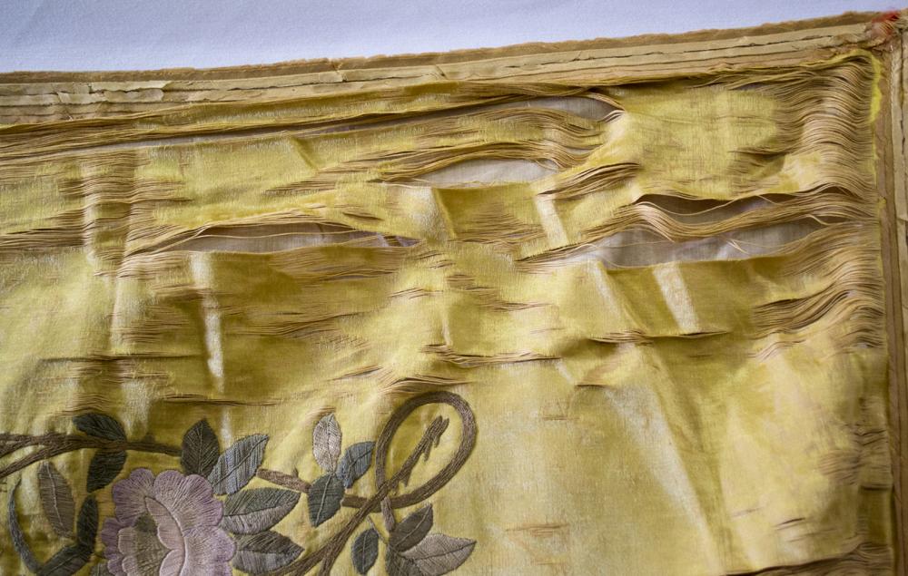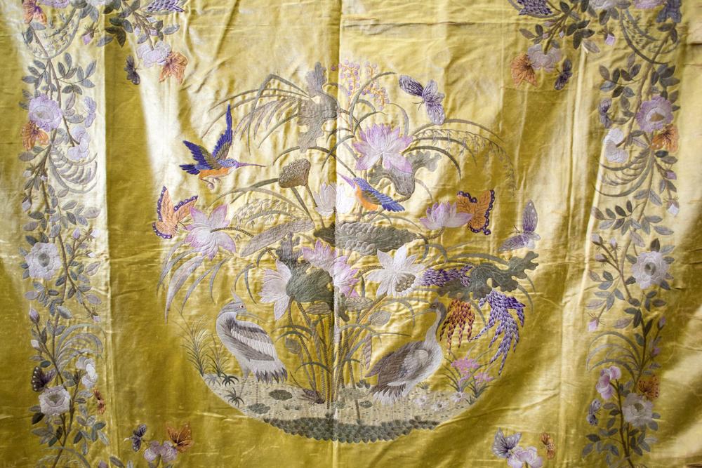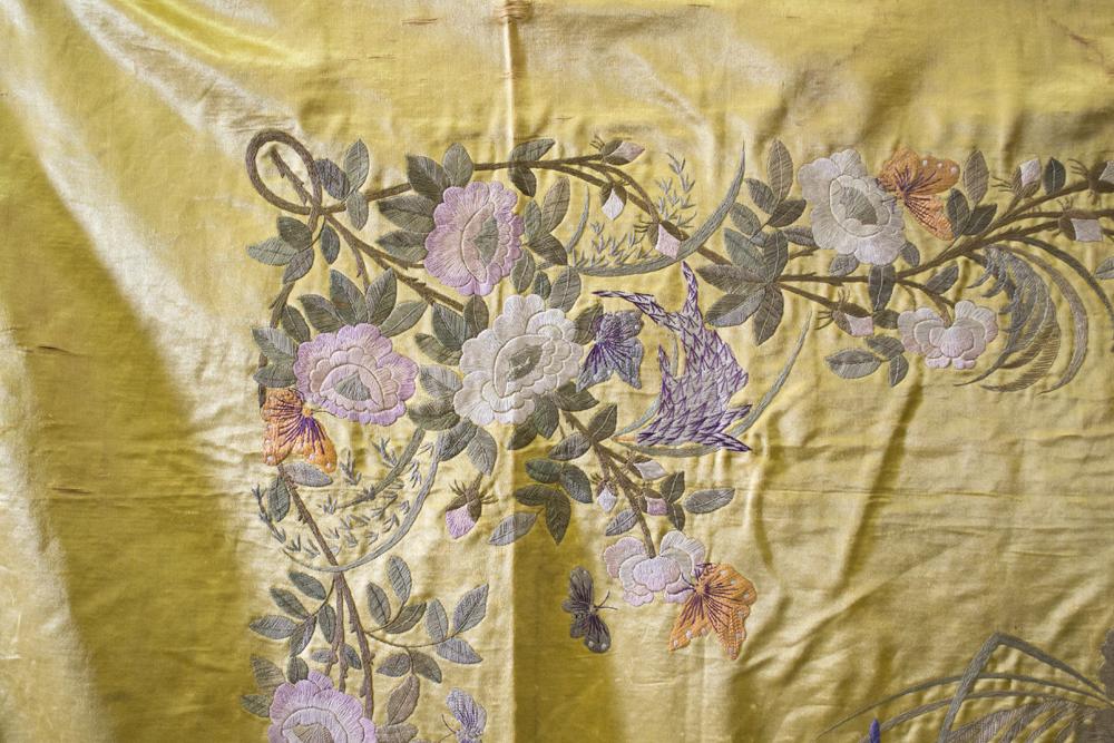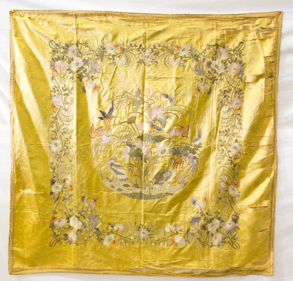 Finely sewn to depict cranes butterflies and birds within a floral landscape against an imperial yellow ground, extremely fine needlework, 53"H X 56"W, loss and separation to upper right corner, lower right corner, lower center and some areas far left, none of the losses affecting the needlework, with cotton lined backing, circa 18th/ealry 19th century.
