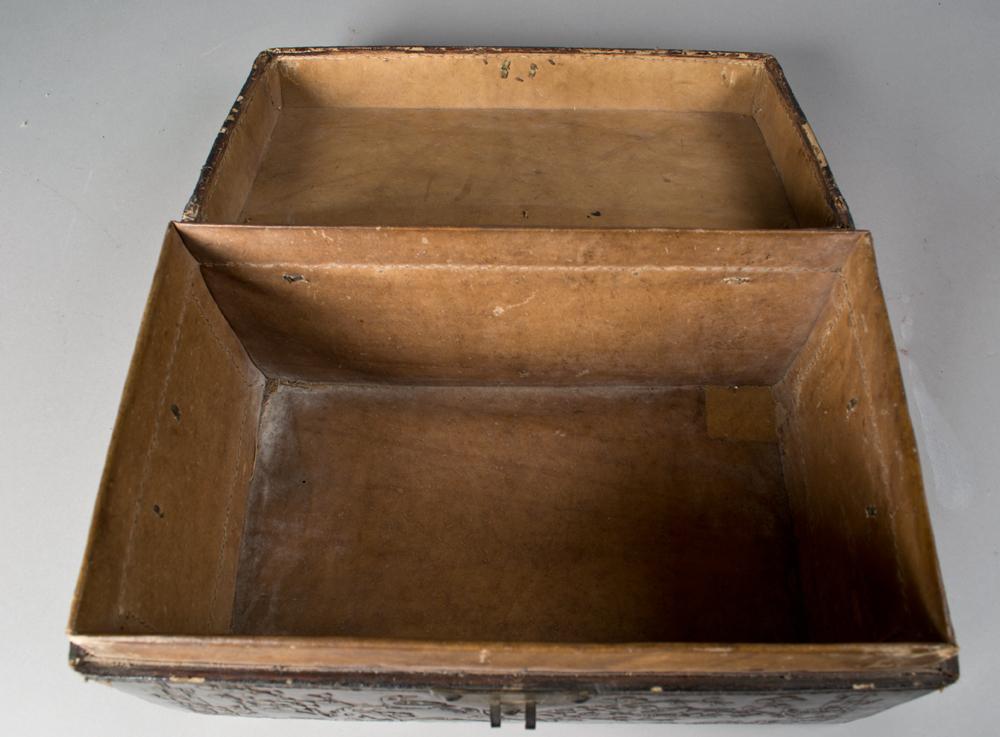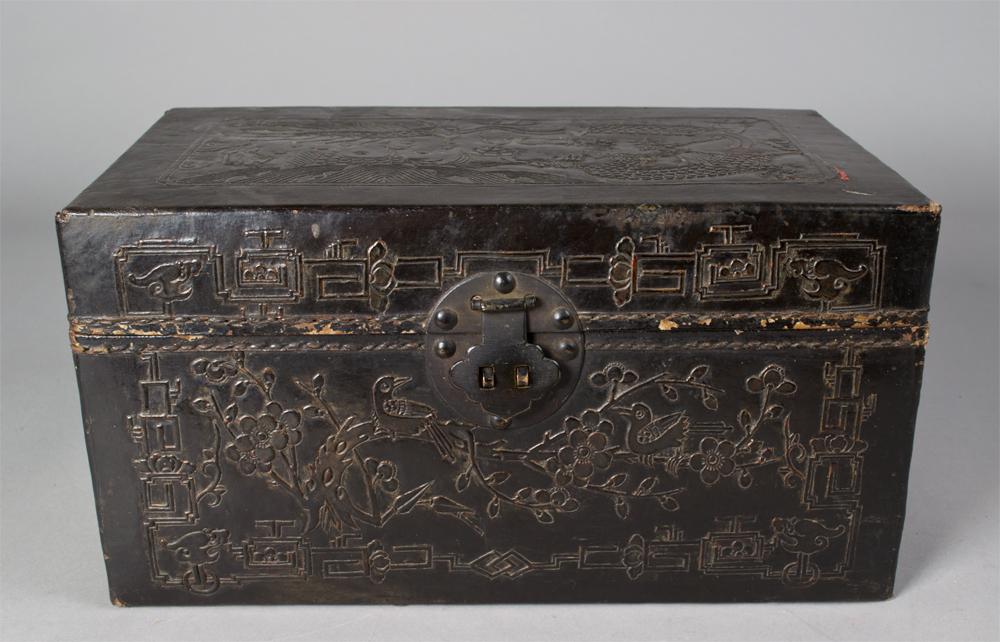 Large box with top depicting dragon and fish, the front decorated with blossoms and birds, with iron lockplate, handles and hinges. 7.75" H x 14.5" W x 8.5" D. Circa mid to late 19th century.