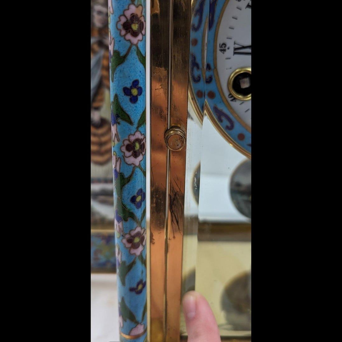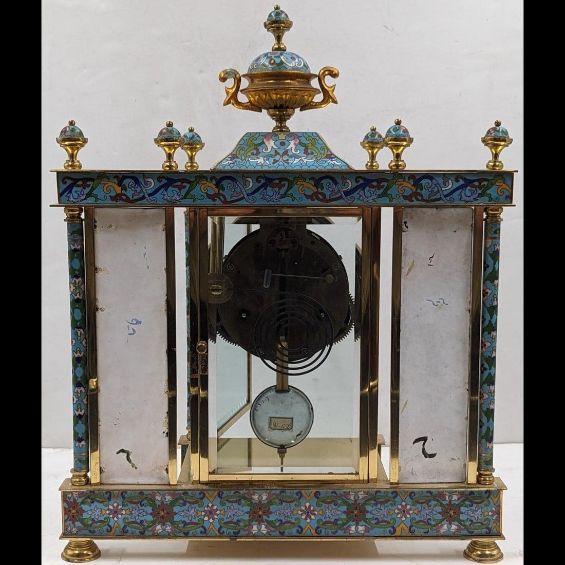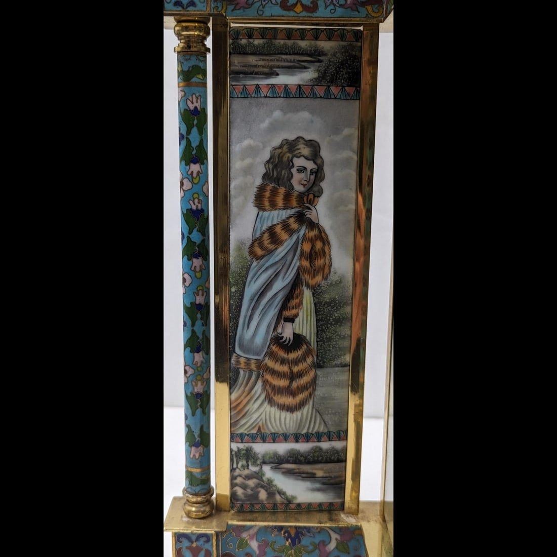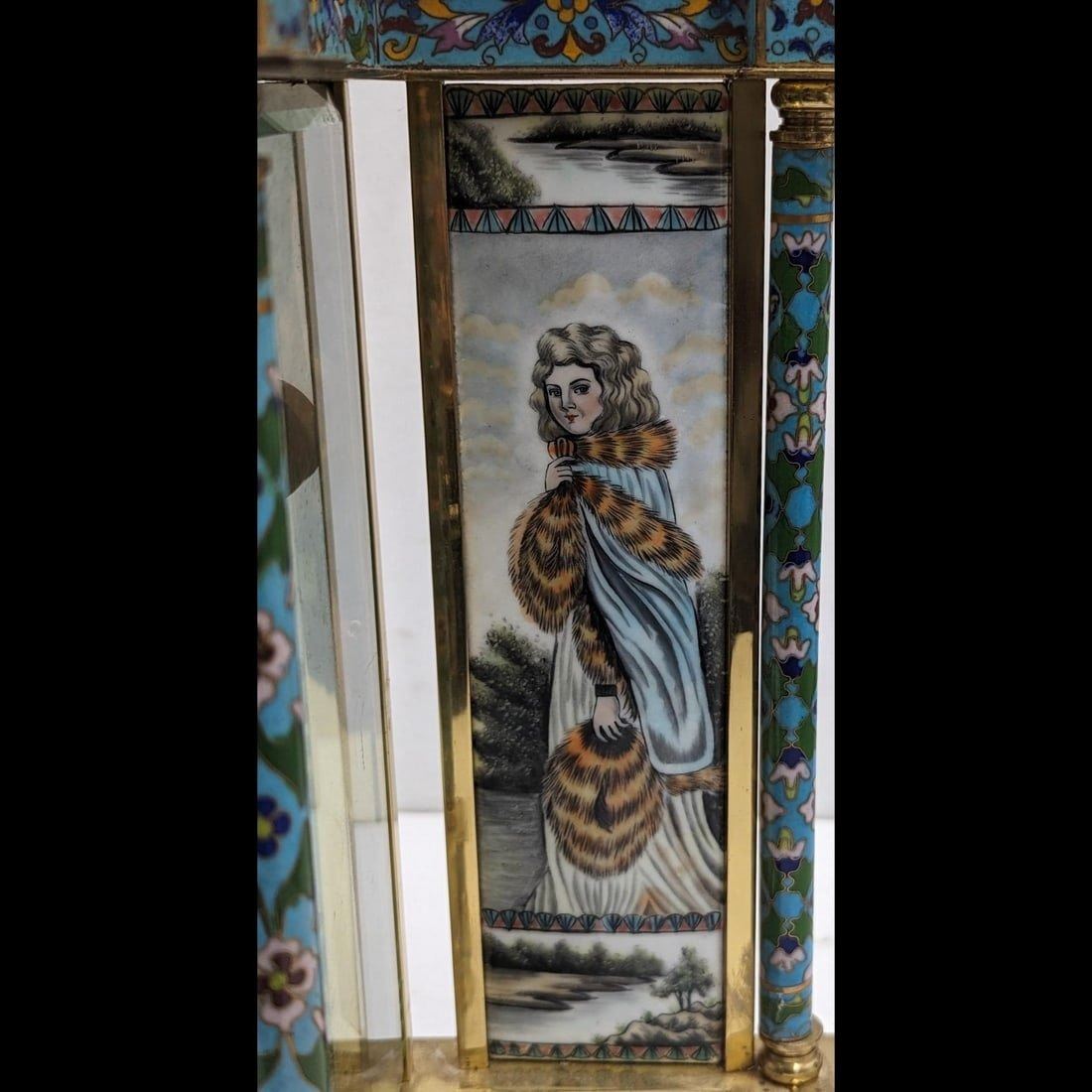 ***RE-LISTED UNDER NEW CONSIGNMENT*** A Fine Antique Cloisonne And Brass Mantle Clock With Painted Porcelain Scenes. Measures approx. 19" X 7" X 14 1/2". Measure 7 1/4" X 2 1/4". Provenance: One Person Private Estate Central Florida.