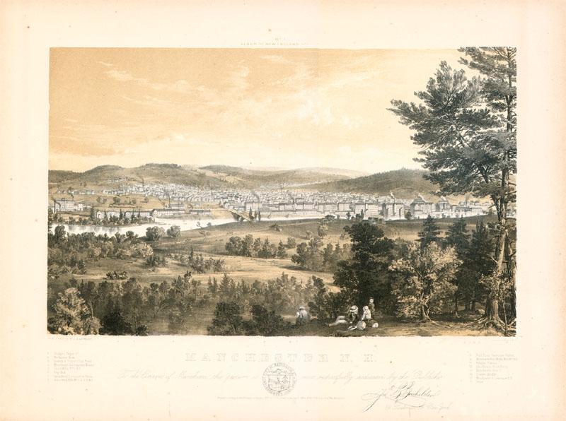 1856. 20” X 15”. Wonderful panoramic view overlooking the city of Manchester, New Hampshire. Produced by J. B. Bachelder, prominent artist well known for his exceptional prints. Lithographed by Endicott & Co., N.Y. It is number 1 from the series of New England Scenery. Printed below the image and logo is a dedication “To the Citizens of Manchester this picture is most respectfully dedicated by the Publisher”. Points of interest including Blodget Paper Co., Boston & Concord Railroad, Manchester Locomotive Works, Stark Mills, Amoskeag Mills and others are detailed. A fine, early print great for display with nice eye appeal. Fine.