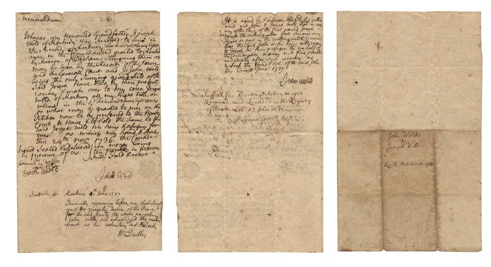 William Dudley (1686 – 1743) a man of brilliant talents, which he exercised both in civil and military life. At the age of twenty he was sent on a most important and delicate mission to Canada, to negotiate an exchange of prisoners. Son of Joseph Dudley Colonial Governor of Massachusetts Bay Colony from 1702 to 1715. Samuel Gerrish. Publisher, bookseller. A strong advocate of the Regular Singing Movement in Boston during the 1720’s. John Weld. Member of the prominent Weld family of Massachusetts. “Whereas my honoured Granfather Joseph Weld of Roxbury has recorded to him in the records of Roxbury, two hundred & seventy eight acres in the four thousand granted to Roxbury by reason of Dedham, ( ) them as may be seen by the records of the town and general court and John Weld being the only surviving grandchild of the said Joseph have & Do by these presents convey and make over to my cosin Joseph Weld of Roxbury all my right, title or interest in the said two hundred & seventy eight acres or what may be granted to me on the petition now to be preferred to the honorable court to have & to hold the same to the said Joseph Weld his heirs & assigns forever. As witness my hand & seal this 24th Novr. 1736…Signed by John Weld at the conclusion and witnessed at left by Sarah Weld. William Dudley has signed below indicating that John Weld appeared “and acknowledged this instrument as his voluntary act & deed” John Weld signs again on the following page “It is agreed by & between the parties within …John and Joseph Weld that in case of any heirs of the first named Joseph except the within grantor shall recover any right or part in the within granted…the said John or his heirs will repay to Joseph, his heirs or assigns the one half of the consideration money…John Weld. Below, Prominent Bostonian Samuel Gerrish signs recording the transaction. A superb association of prominent Massachusetts individuals signing a single land memorandum document.