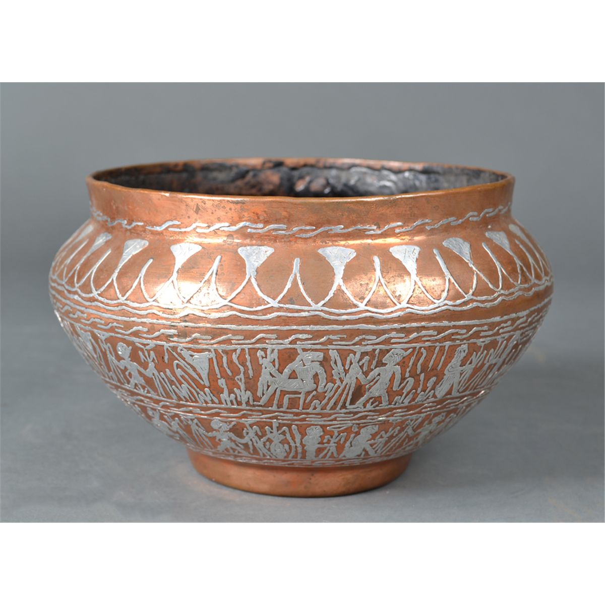 Of traditional form, the copper bowl overlaid with multiple bands in silver depicting Egyptian figures and symbols. 5.5" H x 9" Dia. With an old surface polish, the interior with tar like residue, otherwise very good condition. Circa 19th century or possibly earlier. Private collection Oxford, MI.