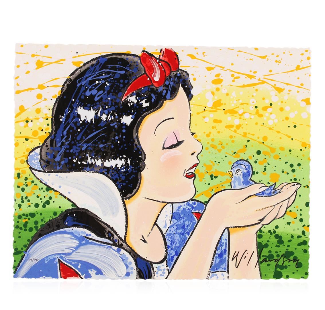 Licensed and loved for his incomparable interpretations of Disney characters, David Willardson produced a limited number of these signed serigraphs on deckled paper. This thoroughly charming image of Snow White befriending a little bird is classic Disney, and one of Willardson's most coveted editions. Frame it for your child's room or nursery, and they will grow up with Love. Limited Edition S/N Serigraph # 78/495.