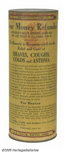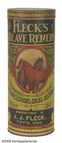 <B>A Fine Fleck's Veterinary Heave Remedy Container</B></I> This beautiful paper label veterinary cure, manufactured by J. J. Fleck of Tiffin, Ohio, is one of the most desirable examples of this type. Complete with contents, the lid fits nicely and retains most of the matching label. One small chip is missing from the very top. Otherwise we believe this would be considered a near mint example. Bold color and a nice graphic of two horses in the center make this a piece to consider for front and center in your collection. 7 3/4" tall. Lot:252