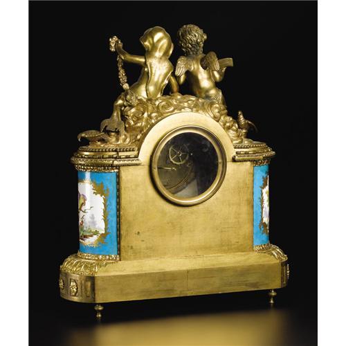 <B>A Fine French Sevres-style Porcelain and Gilt Bronze Mantle Clock</B></I><BR><BR>Unknown maker, French<BR>Circa 1870-1890<BR>Porcelain with polychrome enamel and gilt decoration, gilt bronze, enamel, glass<BR>Marks: dial inscribed: <I>MONBRO FILS AINE, ACQUIER A PARIS</B></I>18.5 inches high x 17 inches wide<BR><BR>The shaped case with rounded ends, mounted with bleu celeste ground porcelain plaques decorated with amorous couples in landscapes, on shaped base raised on toupee feet, the dial surmounted by two cherub figures.<BR><BR><b>Shipping:</b> Requires 3rd Party Shipping (<a target="_blank" href="http://www.heritageauctions.com/common/shipping.php">view shipping information</a>)