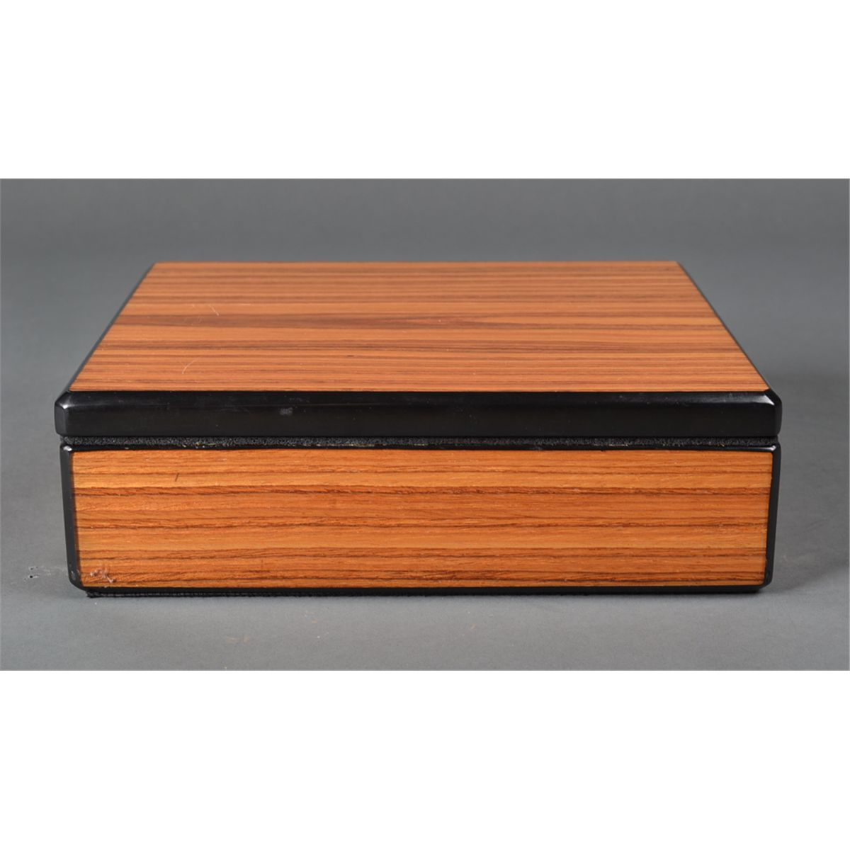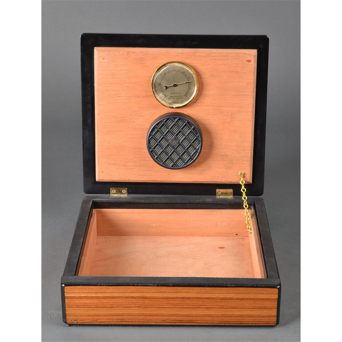 Wood case with black lacquered edges, interior cedar lined and with hydrogmeter and humidifier. 3.5" H x 11" W x 9 & 7/8" D. Hydrometer stamped Made in France, filter monogramed MH. Excellent condition. Circa mid 20th century. Private collection West Bloomfield, MI.