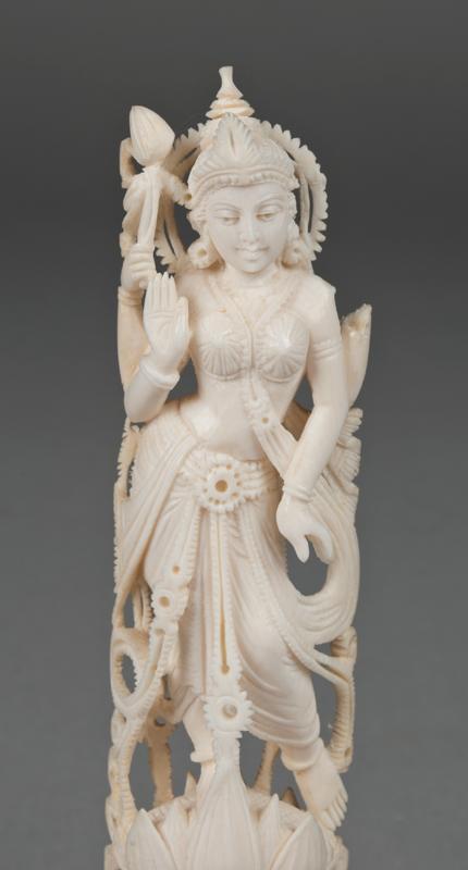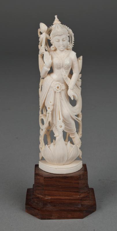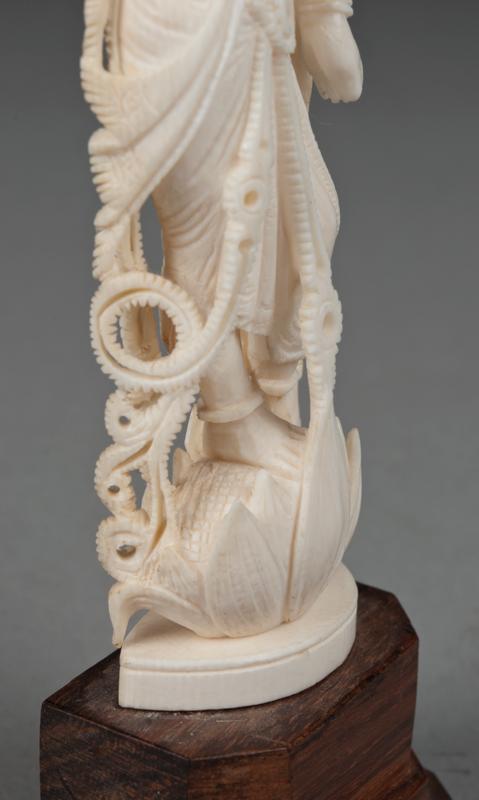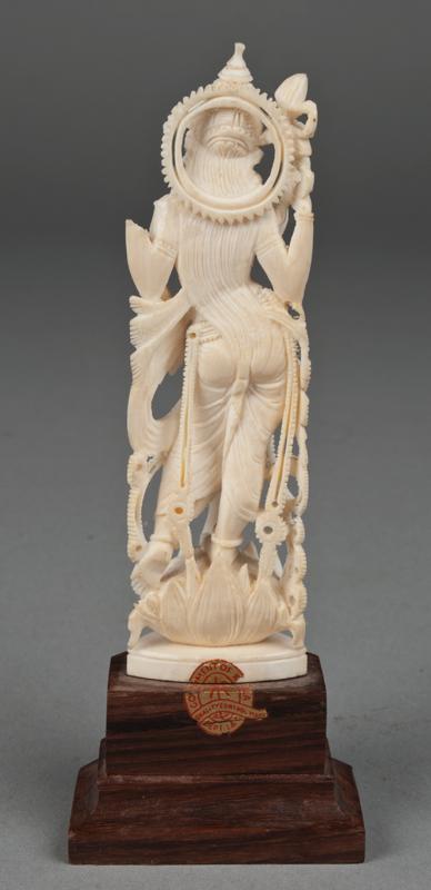 Finley carved with one hand raised, with halo, mounted on a carved wood base, 5.75"H, circa early 20th century.