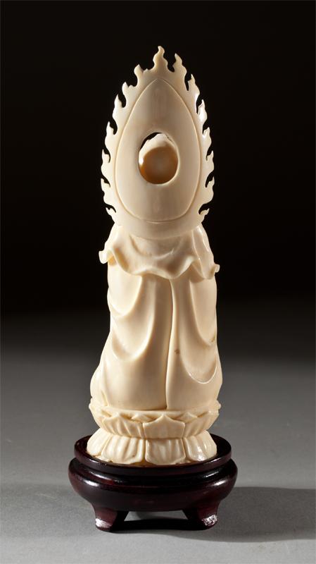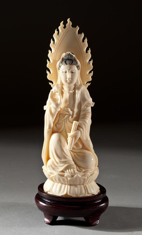 Finely carved to depict a seated Buddha holding a scroll, the head framed by flamed border mandorla, with ink decorated highlights and fitted wood stand. 6.875" H, not including stand. Circa early 20th century. Small loss to mandorla. Appraised in 1988 by Chicago Appraisers Association for $1000, appraisal on file.