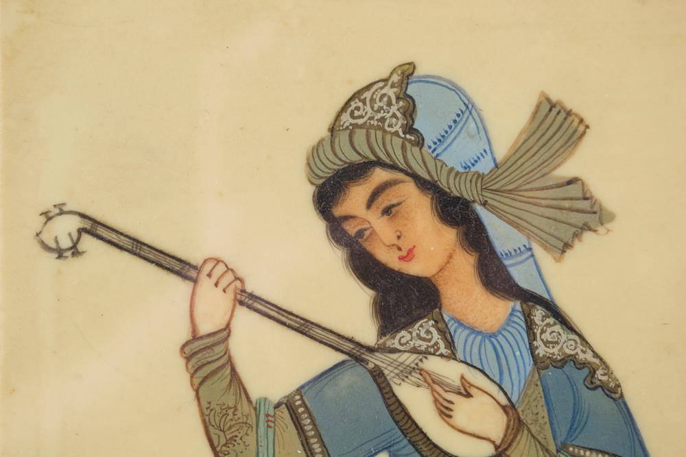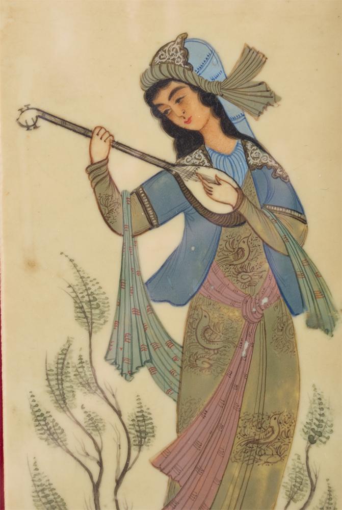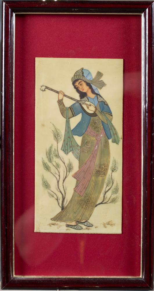 Finely painted to depict a beauty playing a stringed instrument 7.75"H X 3.75"W not including the frame circa 19th century.
