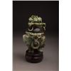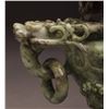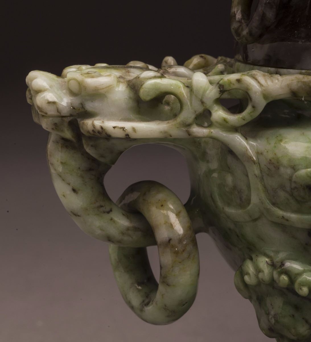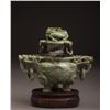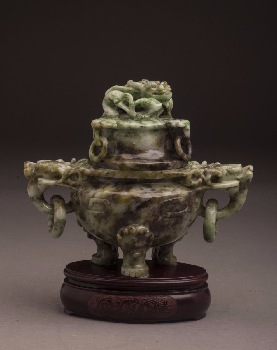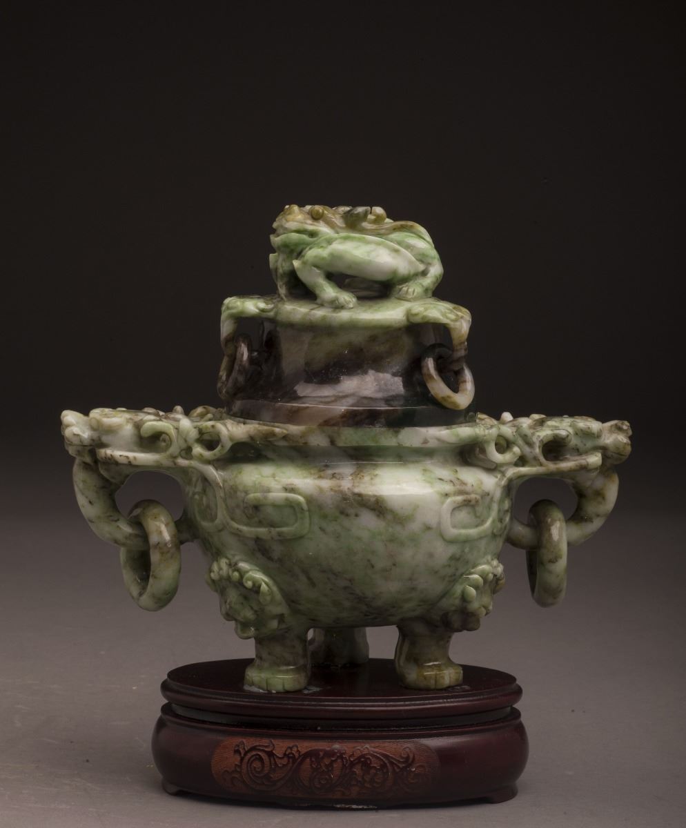 A Fine Jade Incense Burner In Good Condition, Within The Alternative Green Tone Throughout. With Two Delicate Designed Handles In The Form Of Animal-head, Each With One Ring. Supported By Three Legs At Bottom. With Wood Stand.