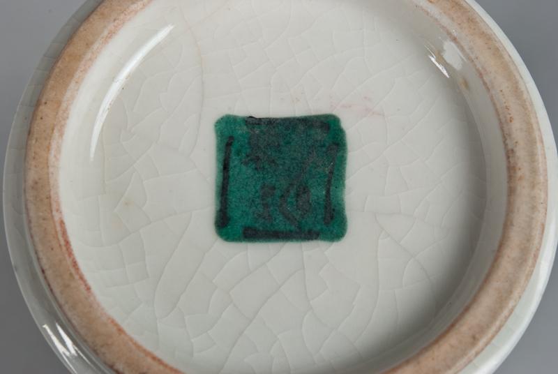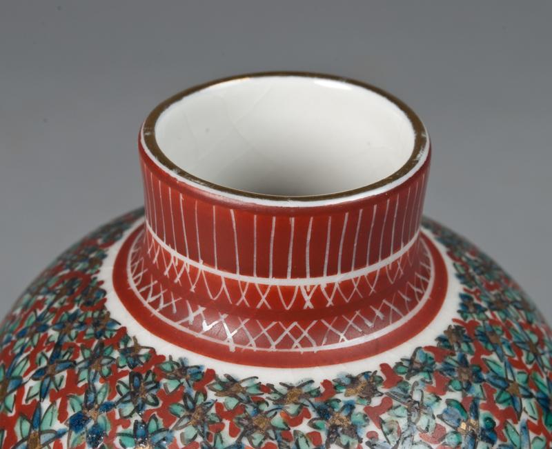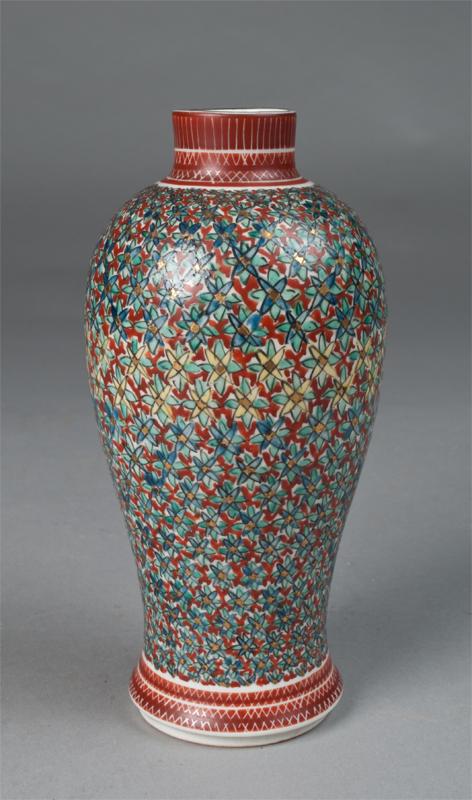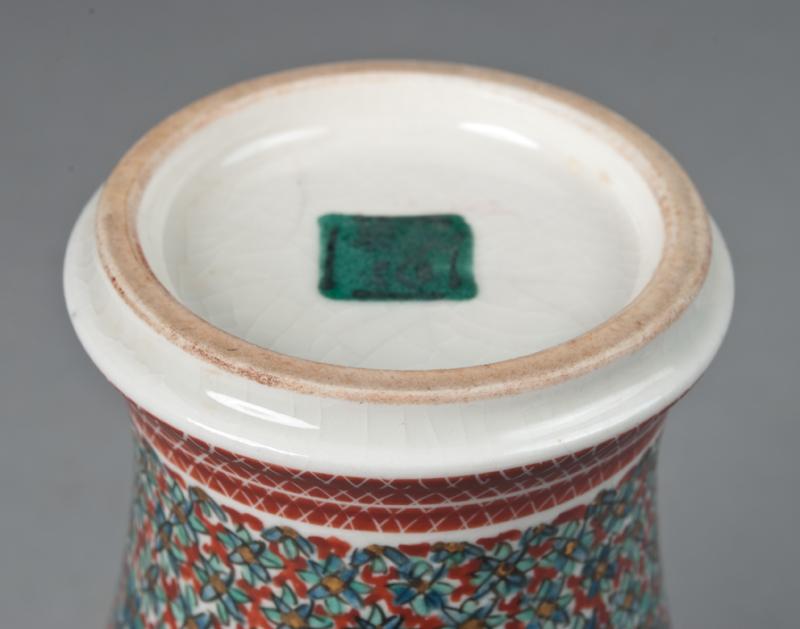 The whole body finely enameled in flowers, the neck and foot room decorated in iron red in x pattern, the base with black mark within a green square. 7.125" H, circa late 19th/early 20th century.