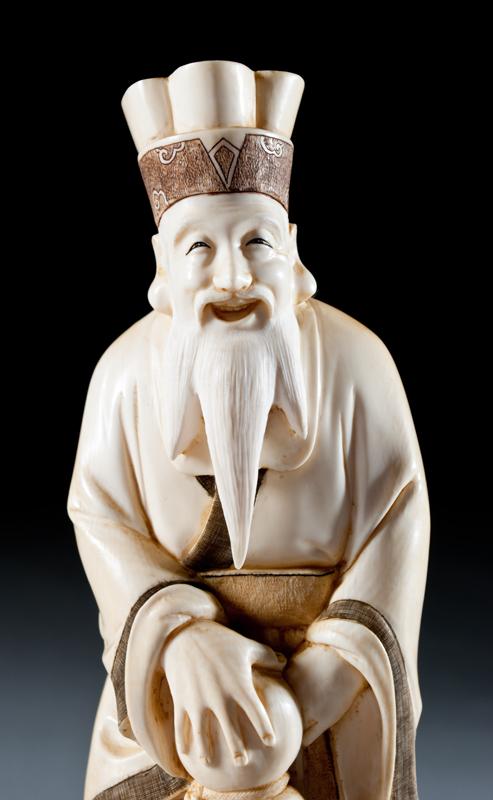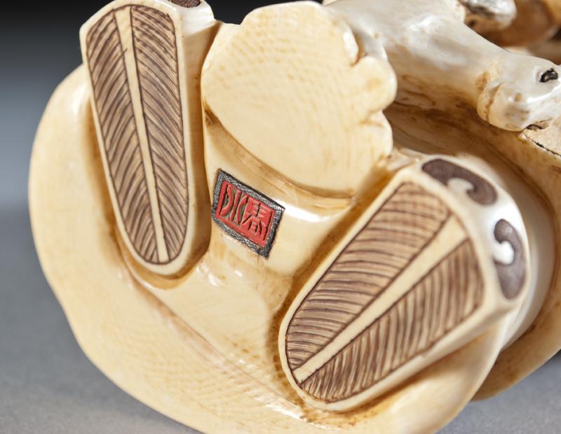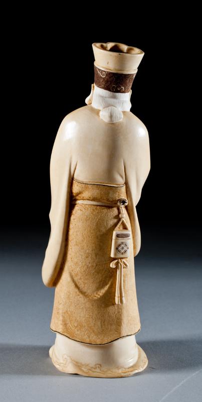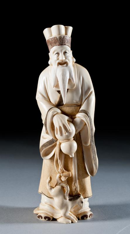 Finely carved to depict a scholar with double gourd bottle and a horse at his foot. The base with two character mark within a red square. 8.5" H, circa late 19th/early 20th century.
