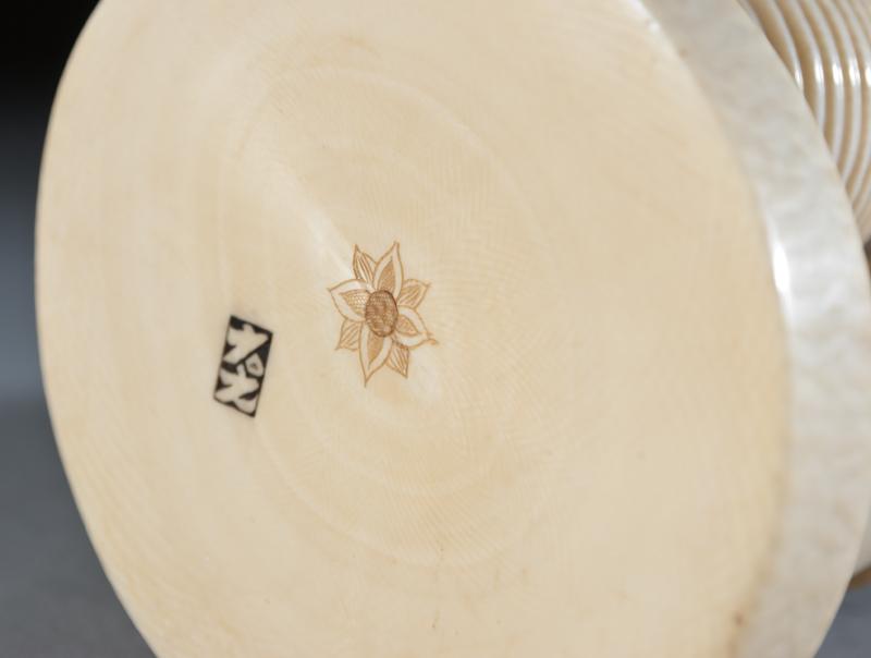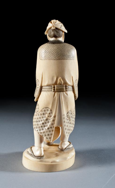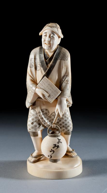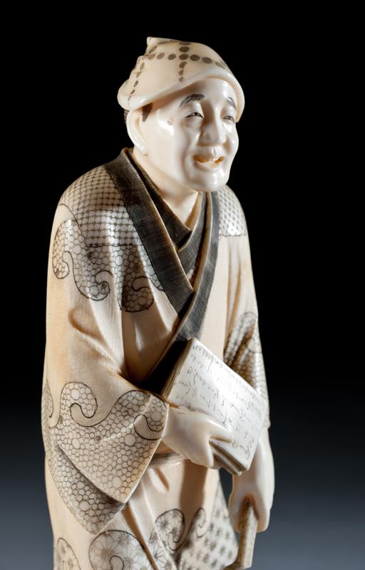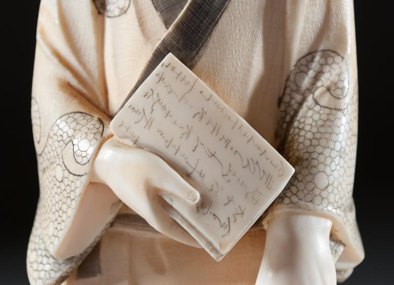 Finely carved to depict an elder holding a book with a pot at his feet, with ink highlights. The base with carved two character mark within a square. 8.75" H, circa late 19th/early 20th century.