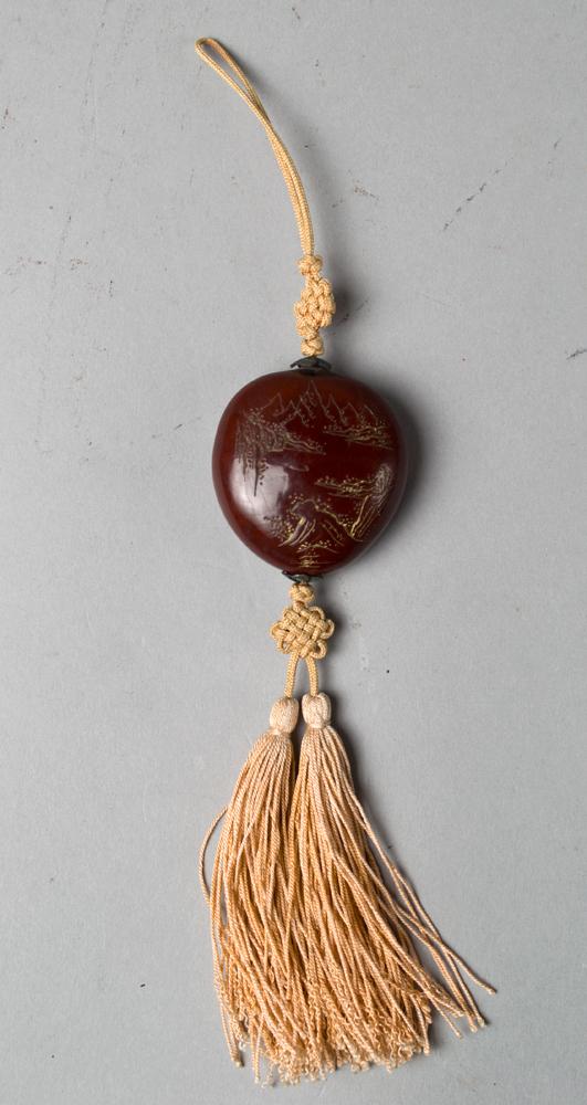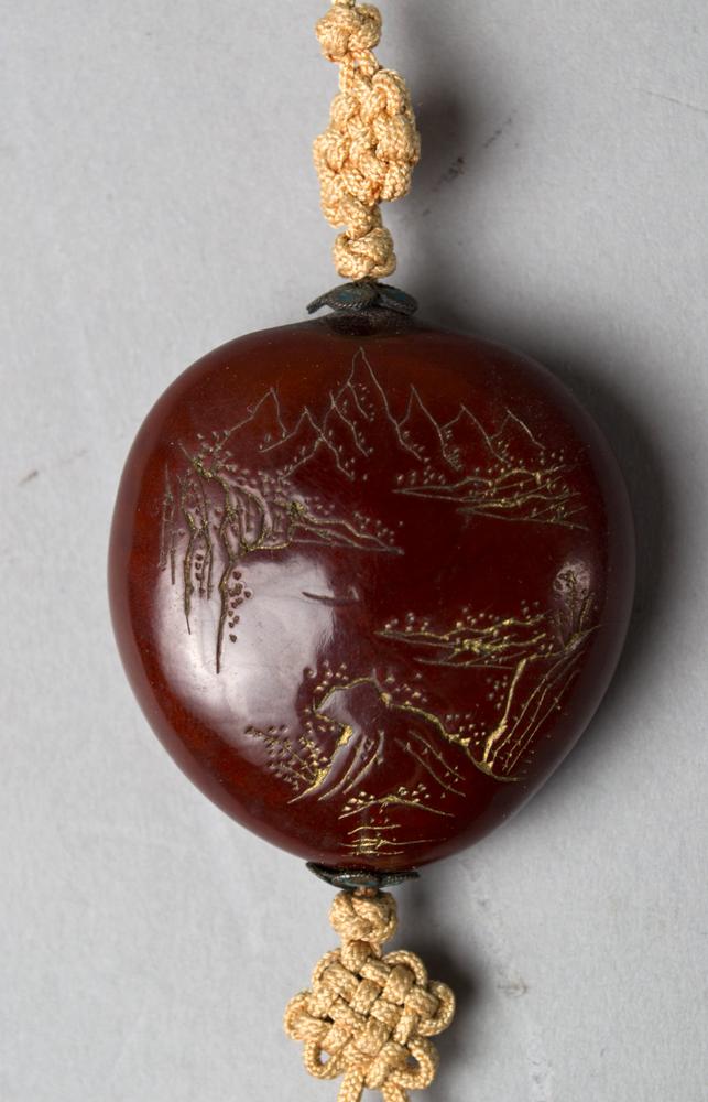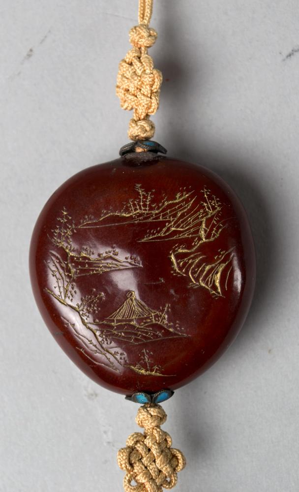 Finely carved to depict village scenes to both sides, with turquoise metal mounts, hung with knotted silk. 7.75" L, circa late 19th/early 20th century.