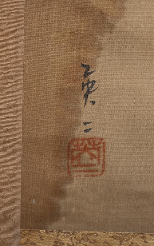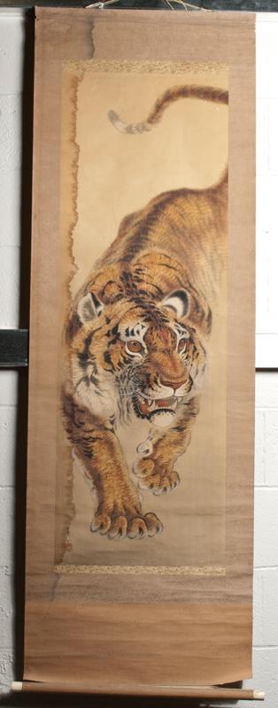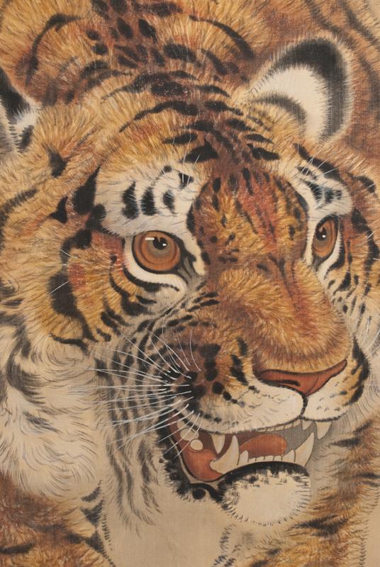 Finley painted to depict a tiger, with brocade boarder, signed and sealed, 68"L x 22"W, circa 19th century, staining to left side.