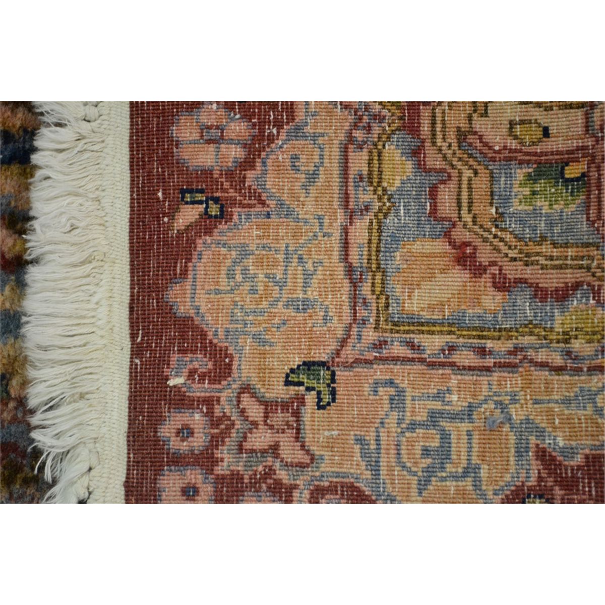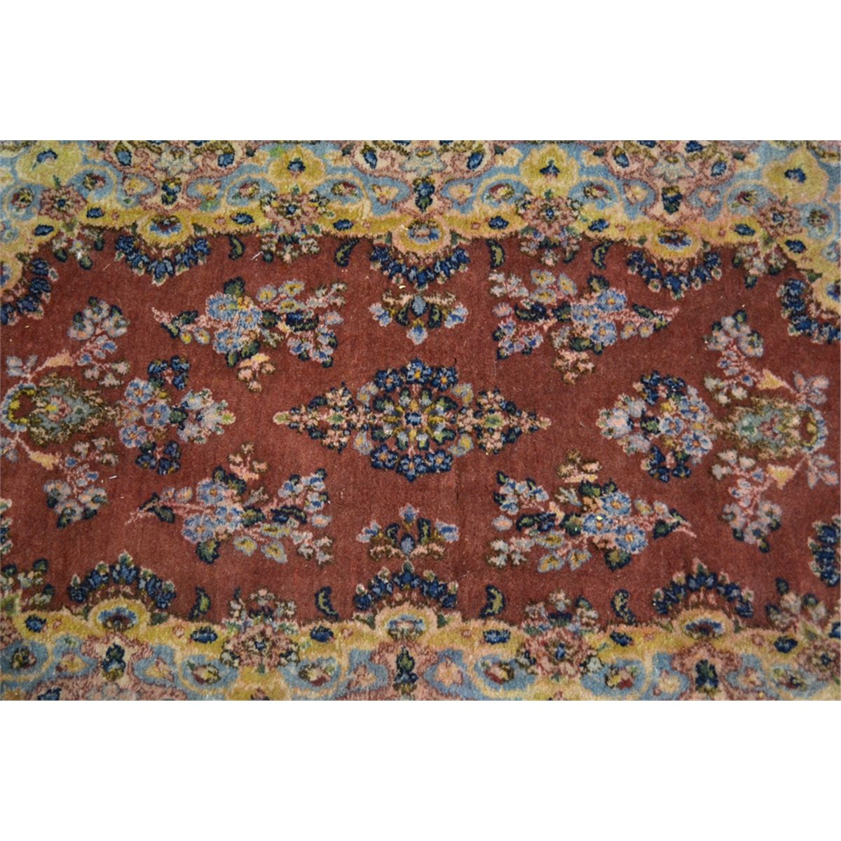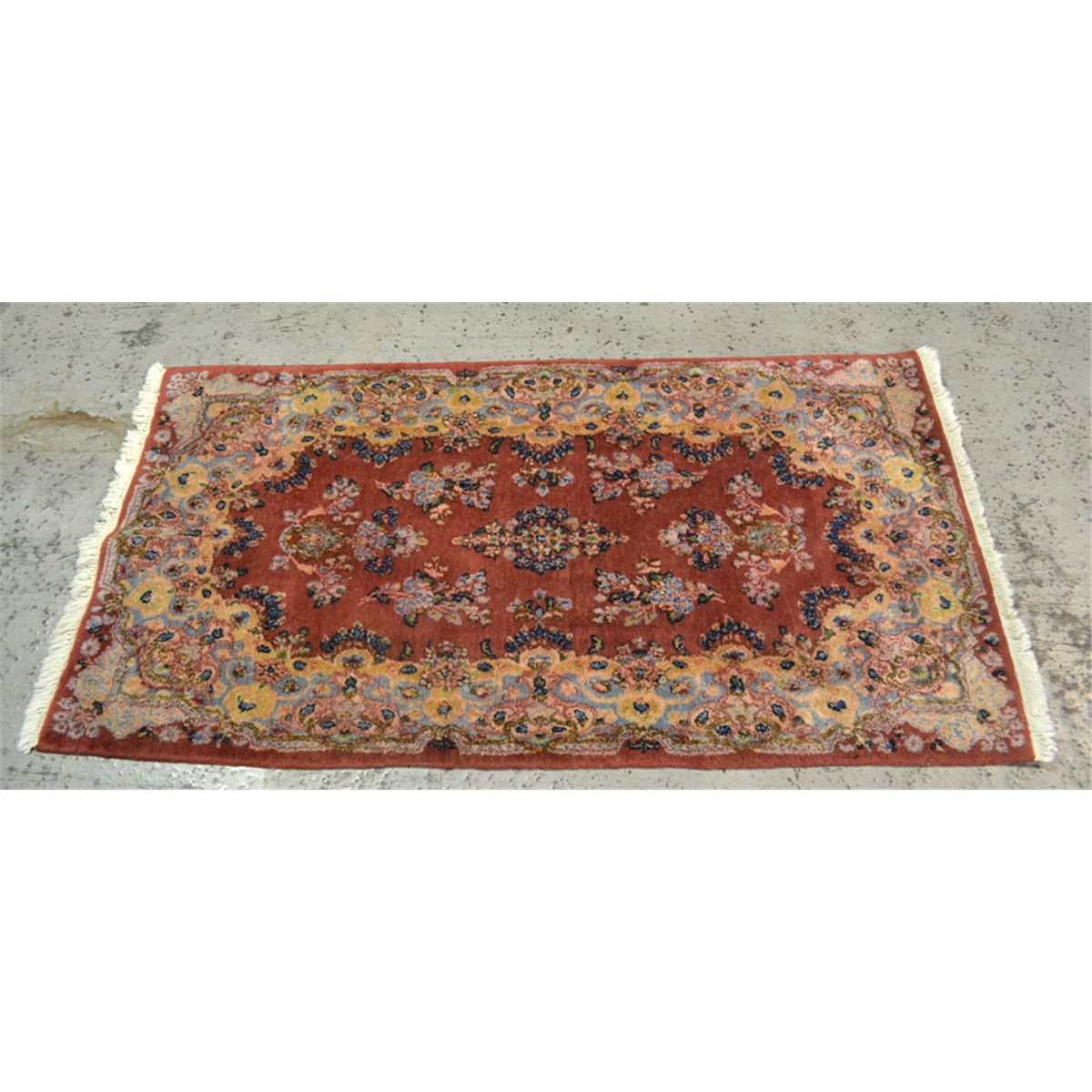 Floral and scroll designs on a red/pink ground with additional colors of blues, greens, pinks, lavenders and tans. 65" x 32", circa mid 20th century. Private collection Troy, MI.