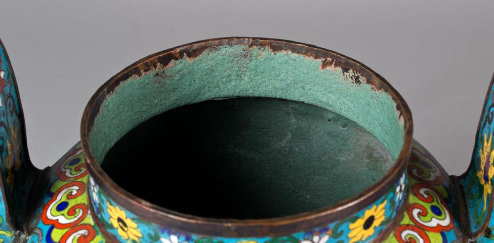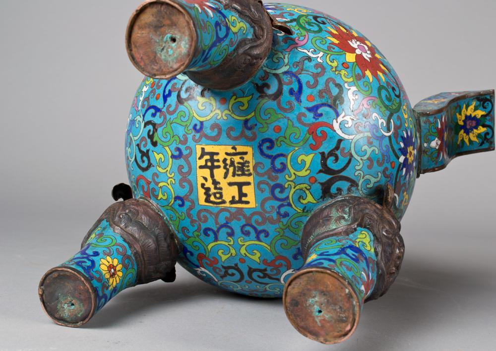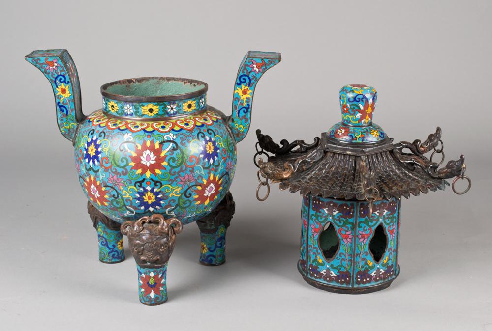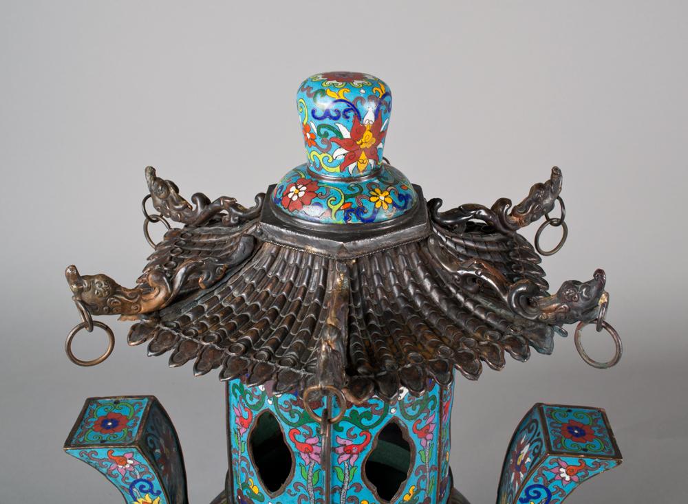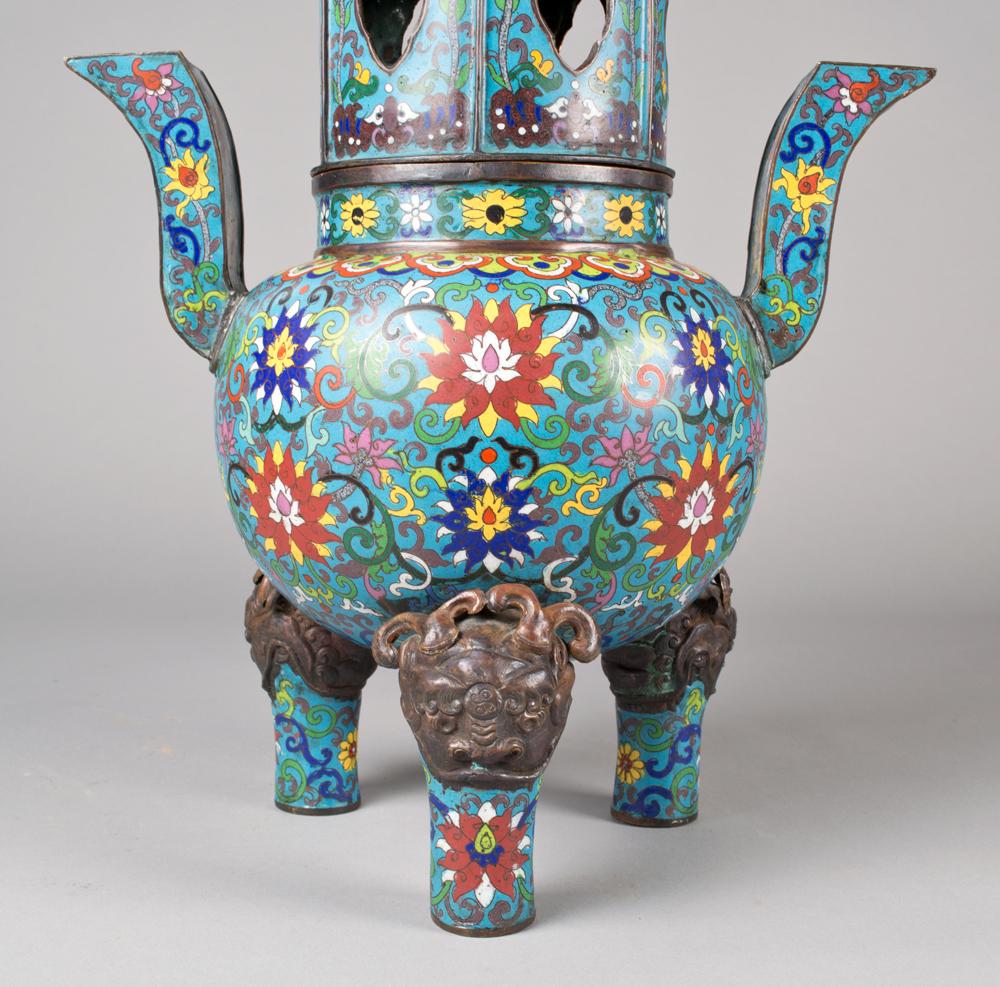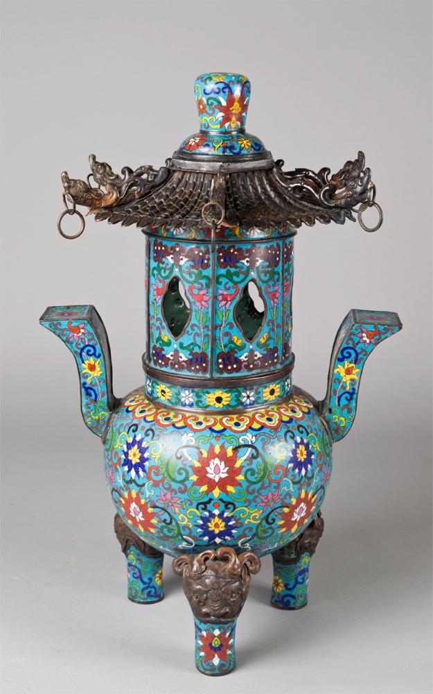The body finely enameled to depict lotus blossoms and tendrils, the top in the shape of a pagoda with six copper alloy dragon head roof tiles, with archaic shaped handles and mythical mask faces on the three leg corners. Bears a Ming mark, but probably early Qing. 22.5" H x 13.5" W, circa 18th/19th century.
