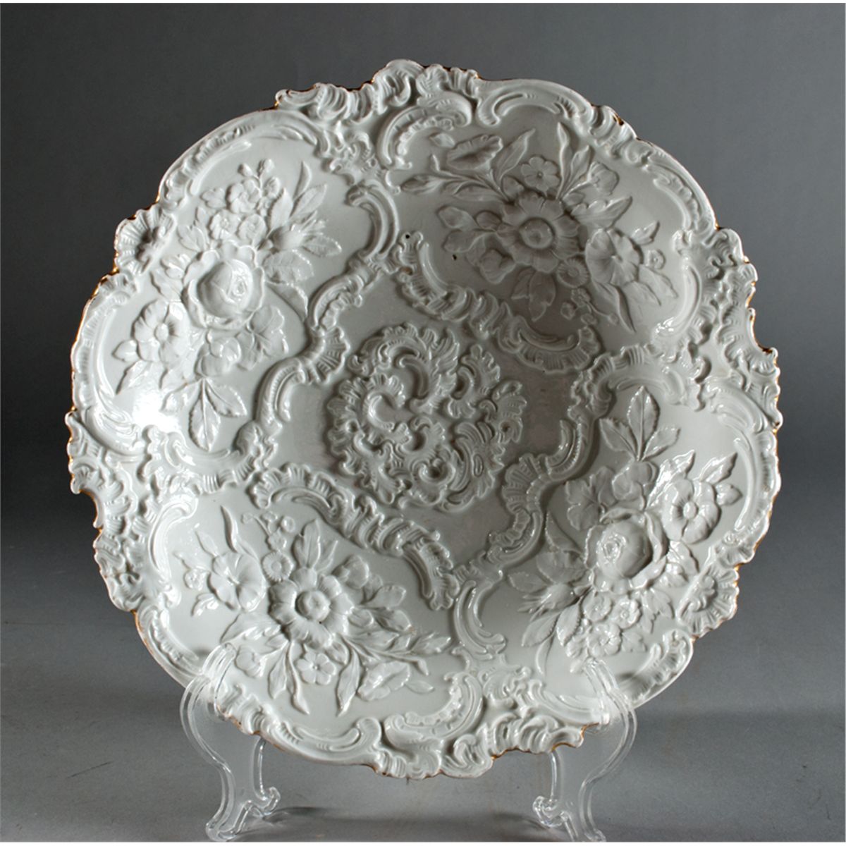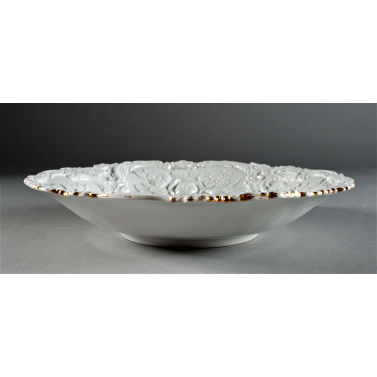 Finely molded depicting raised floral and scrolling designs with gilt rim. 2.25" H x 12" Dia. Wear to gilt and a few firing anomoles in interior. Private collection Roseville, MI.