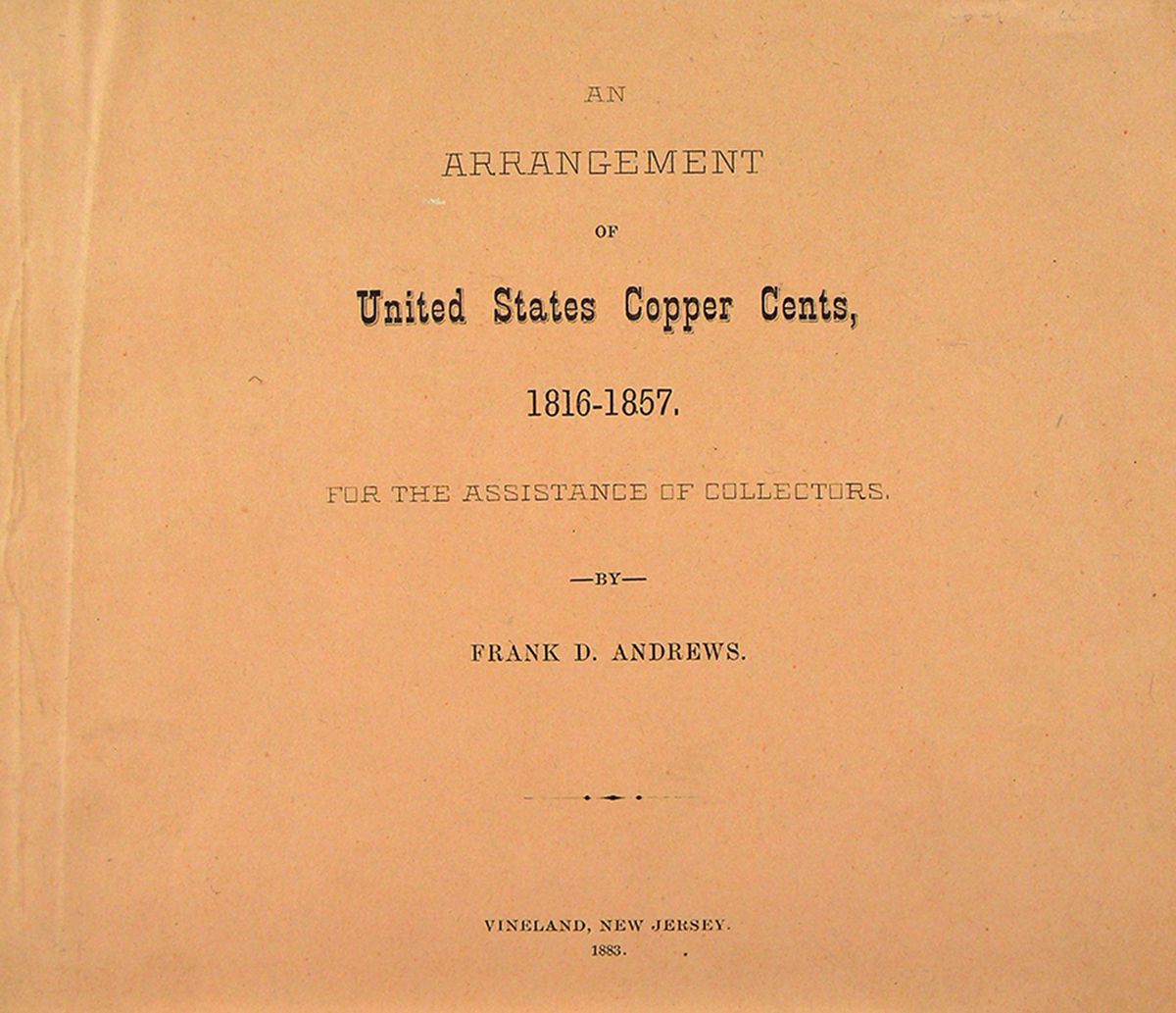 Andrews, Frank D. AN ARRANGEMENT OF UNITED STATES COPPER CENTS, 1816-1857, FOR THE ASSISTANCE OF COLLECTORS. Second edition. Vineland, 1883. 15 by 17.5 cm. Original printed overlapping pale pink or salmon wrappers. 42, (2) pages. Fine. An unusually nice copy in the seldom-encountered pale pink covers. Frank Dewette Andrews made the first attempt to comprehensively cover the later dates, and this second edition remained the standard work until superseded in 1944 by Newcomb. James Macallister thought highly of Andrews calling him "a keen student, with a remarkable memory" and he noted that "I am inclined to believe that he saw every Cent he listed." According to Sheldon, Andrews's "remarkably thorough little monograph" was the fruit of research spanning twenty years. In the preface, the author describes his work as "the result of careful observation" and opines "Perhaps it would not be advisable to spend time that could be better employed on a subject of so little practical importance: but as a recreation from tasks more severe; as a means of training the eye to observe minor differences and variations; and of assistance to the mind in times of mental depression, the Numismatist will find it of much value." Ex Kolbe & Fanning Sale 120, lot 392. Ex Dave Steine library.
