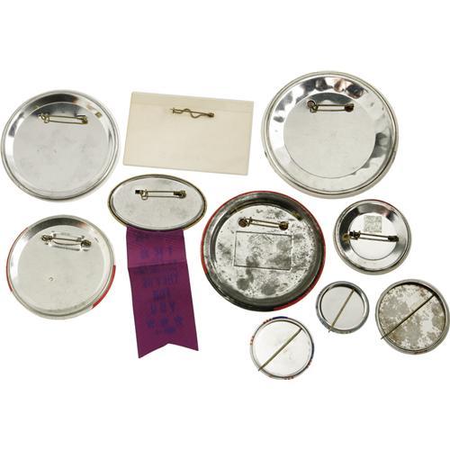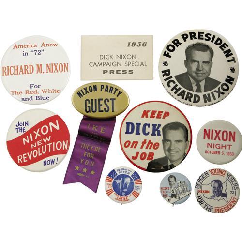 <B>A Fine Selection of Ten "Better" Richard Nixon Buttons</B></I> representing four different elections: 1956, 1960, 1968, and 1972. Especially unusual is the cardboard-insert clear plastic pinback badge for the press corps on Nixon's 1956 campaign train. All in excellent condition. Sizes from 1 1/2" to 4", all shown to scale.