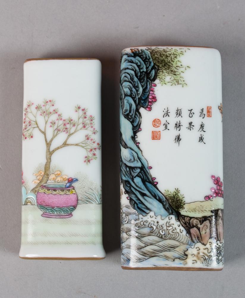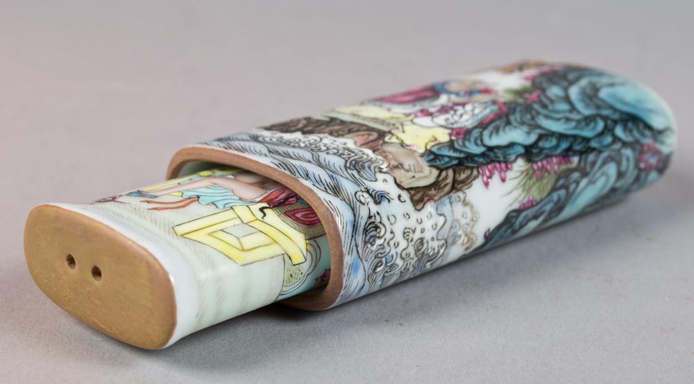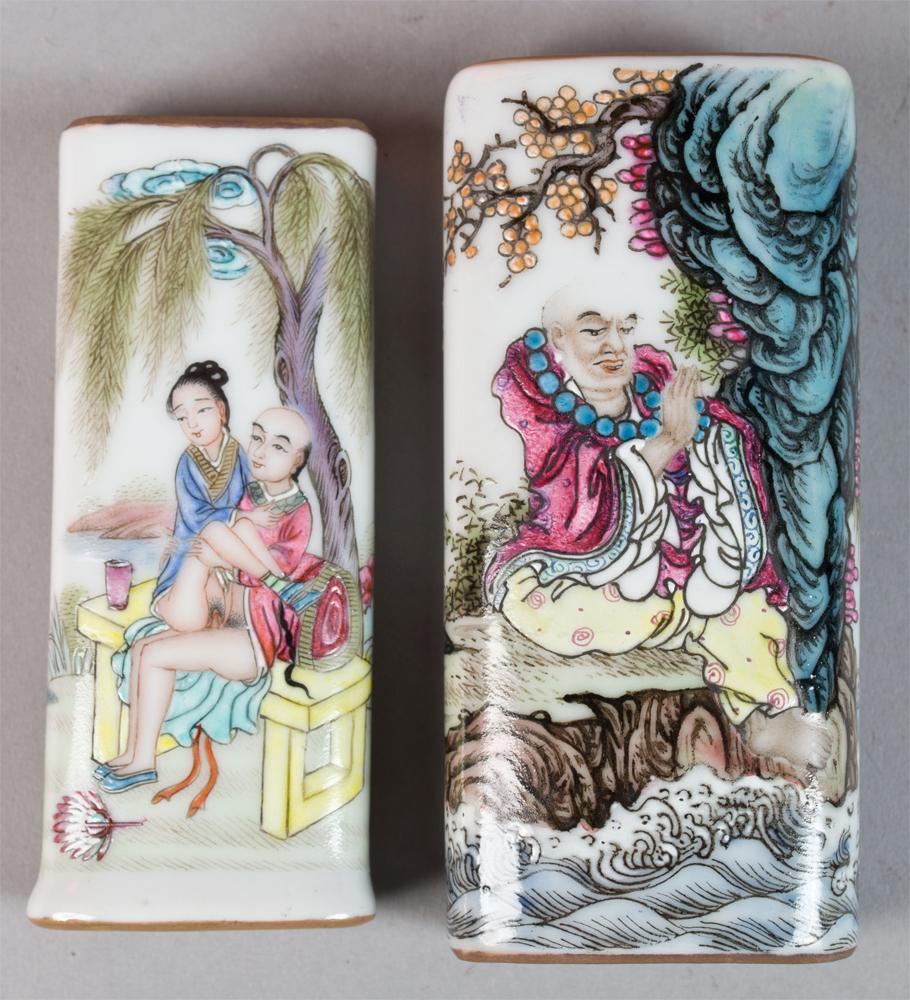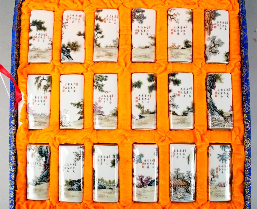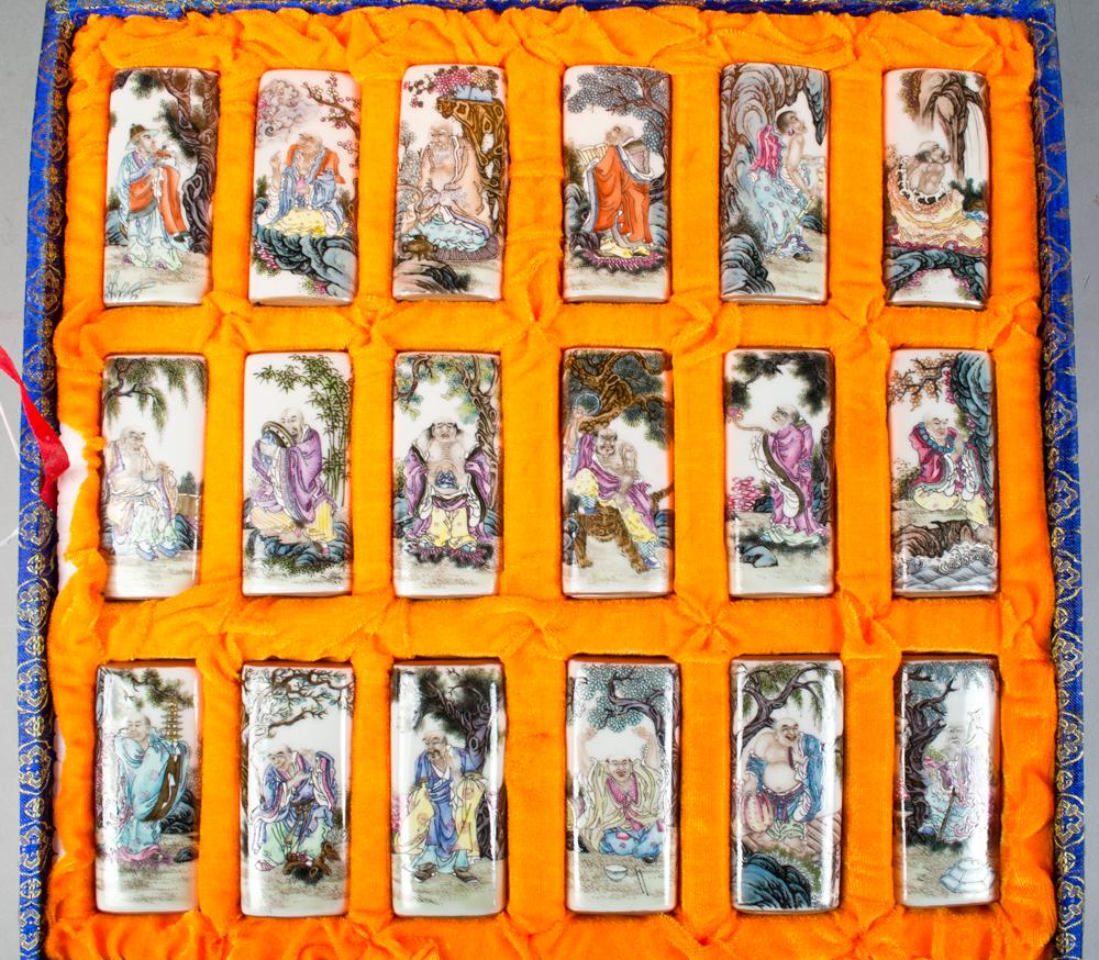All Finely enameled to depict the eighteen Lohan the reverse painted with calligraphy and three seal marks all in fitted silk box each measures 3.5"L circa 20th century, purchased by the consigner while working in Hong Kong in the 1960's.