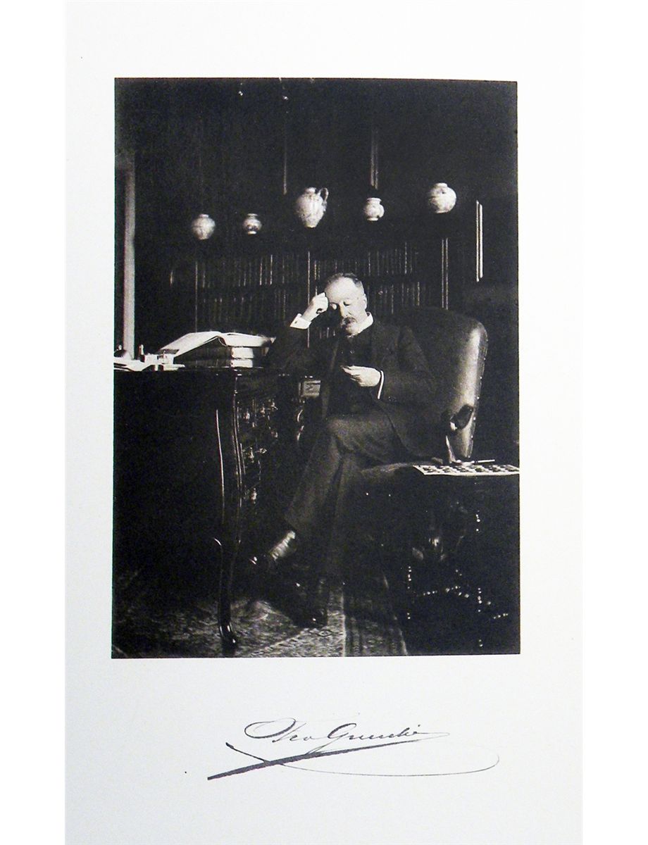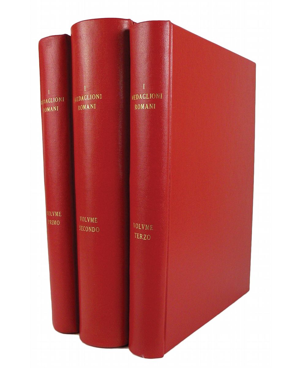 Gnecchi, Francesco. I MEDAGLIONI ROMANI. Milano: Ulrico Hoepli, 1912. Three volumes, complete. Folio, later matching red cloth, gilt; original pictorial card covers bound in. lxviii, 83, (5); (16), 158, (6); (16), 234, (6) pages; fine frontispiece portrait of the author seated in his library examining a coin; titles printed in red and black; 162 superb plates. Corner bump; else fine. The very rare original edition of this comprehensive standard reference work on Roman medallions. The plates are immeasurably superior to those in the reprint. Clain-Stefanelli 4963*. Grierson 84.
