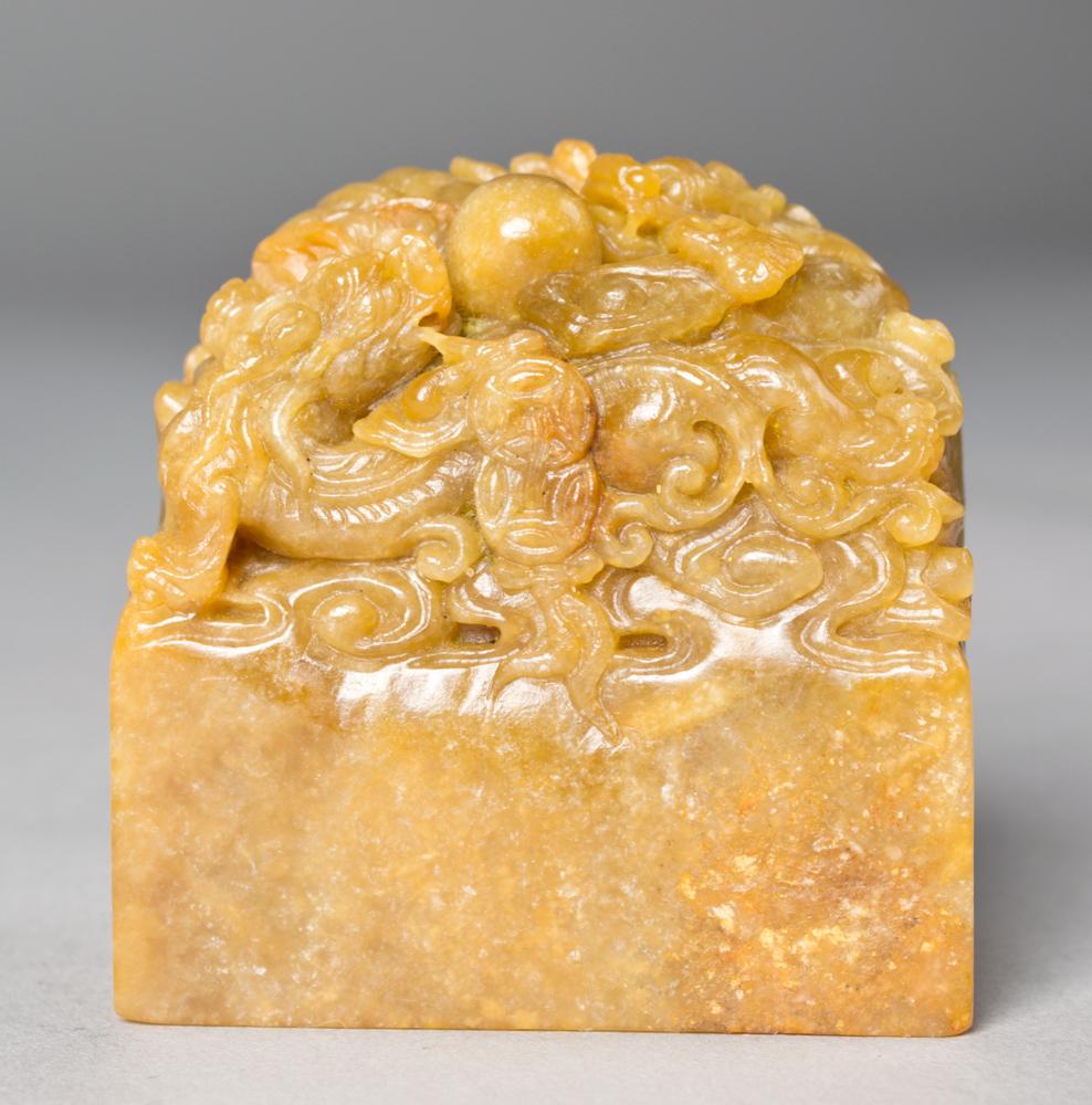 Finely carved with two dragons chasing a flaming pearl the body carved to depict a landscape, the stone a medium yellow amber in color very well done, 2.375"H X 2.125"W circa 19th-early 20th century.