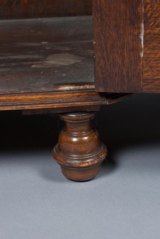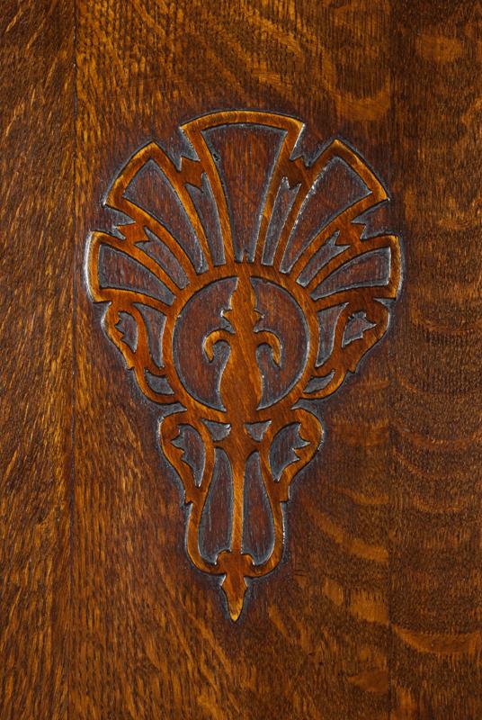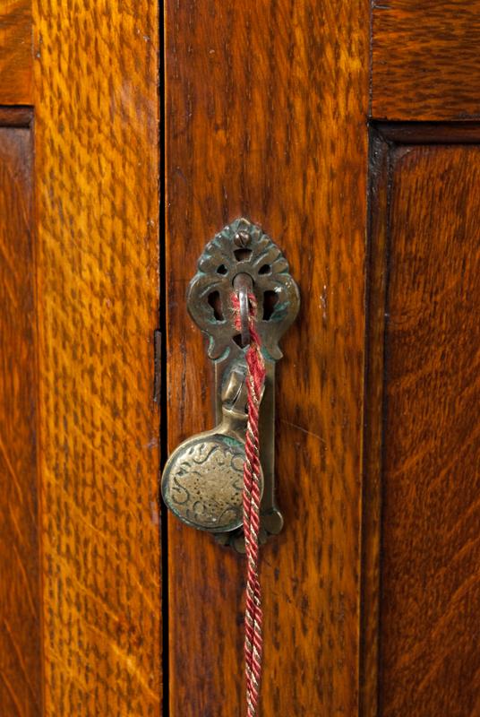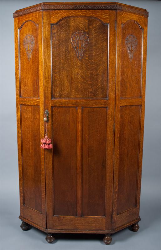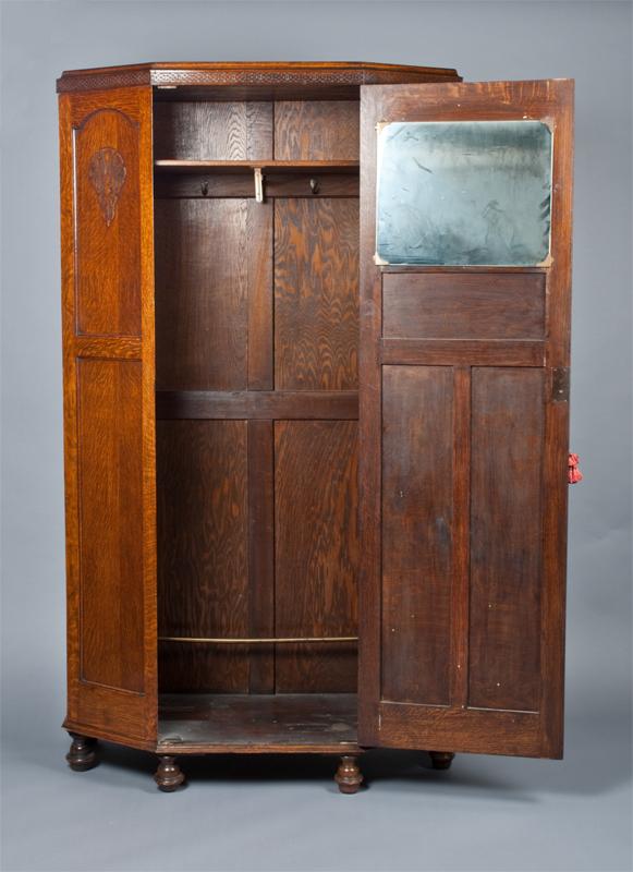 Featuring canted sides with three carved crests. The interior with single shelf, mounted high, brass hangers and hooks, original lock marked English Made with patent numbers. All original glue blocks and appears to retain its' original untouched surface. 75" H x 42" W x 16" D. One of the nicest wardrobes we've seen. Private collection Rochester, Michigan.