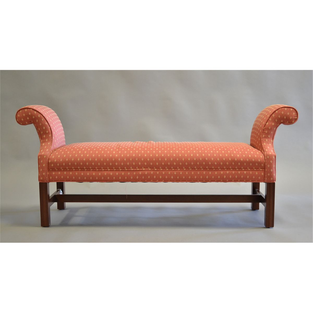 With scrolled arms on carved wood base with ribbing, upholstered in a salmon fabric with gold and cream diamond pattern throughout. 25" H x 60" L x 18" D. Circa mid 20th century. Private collection St. Clair Shores, MI.